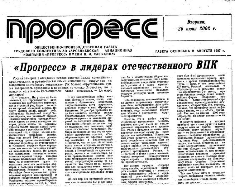 Возвращение к истокамУважаемые читатели! Дорогие заводчане! Название "Прогресс" оправдано по ряду причин. Когда-то именно под таким названием наше издание и выходило в свет. Это была эпоха многотиражных газет. С годами менялся завод, получая новые оборонные заказы, обеспечивая горожан работой, реализуя новые социальные программы. Это значительно расширило информационные рамки, что привело и к увеличению формата, и перемене названия "вкладыша" — "Арсеньев. Городская тетрадь". В период, когда авторитет ОАО ААК "Прогресс" значительно вырос, а продукция завода стала востребована не только в России, но и далеко за ее пределами, приложение получило название "Подъём!". Тогда заводчане готовилось к празднованию 75-летия родного предприятия. Прошло два ударных года, и трудовой коллектив принял решение вернуть изданию первоначальное название — "Прогресс". Это не возврат в прошлое, это обращение к истокам, к тем корням, которые позволяют многотысячному коллективу предприятия строить достойное будущее. "Прогресс" — это не только название нашего завода. Прогресс — это направление развития от низшего к высшему, поступательное движение вперед, к лучшему. Так живет и развивается наша авиакомпания. Так стараемся работать и мы, помогая заводу и каждому из вас развиваться дальше, идти в ногу со временем, не забывая при этом свое прошлое. Мы стараемся всегда быть интересными и содержательными, и будем очень рады вашим откликам, пожеланиям и интересным сообщениям. «Прогресс Приморья», № 22 (233) от 30.05.2013 г. |