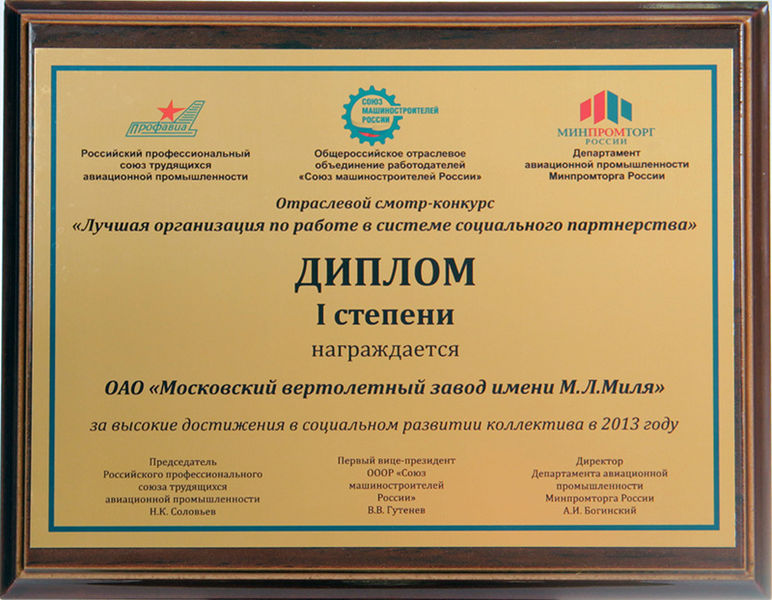 Вертолётный завод имени М.Л. Миля — лучшийМосковский вертолетный завод имени М.Л. Миля холдинга "Вертолеты России" (входит в госкорпорацию "Ростех") стал победителем отраслевого смотра-конкурса "Лучшая организация в работе по системе социального партнерства" в номинации "За высокие достижения в социальном развитии коллектива в 2013 году". Конкурс организован Департаментом авиационной промышленности Минпромторга России, Общероссийским отраслевым объединением работодателей "Союз машиностроителей России" и Российским профессиональным союзом трудящихся авиационной промышленности. Награждение победителей смотра-конкурса прошло в конгресс-центре московского Центра международной торговли. Получая почетный диплом, исполнительный директор Московского вертолетного завода имени М.Л. Миля Михаил Короткевич отметил, что первичная профсоюзная организация и коллектив предприятия добились серьезных результатов в деле социального развития: перспектива работы на заводе стала очень привлекательной для выпускников вузов. Молодежь приходит на завод с расчетом на перспективу долгосрочной трудовой деятельности. Поблагодарив организаторов смотра-конкурса за высокую оценку системы социального партнерства на предприятии, Михаил Короткевич сказал, что почетный диплом — награда не руководству, а всему коллективу Московского вертолетного завода имени М.Л. Миля. Смотр-конкурс 2014 года посвящен 80-летию со дня образования Российского профсоюза трудящихся авиационной промышленности. Основная цель — развитие коллективно-договорных отношений на предприятиях отрасли. Участники конкурса оценивались с точки зрения соблюдения взаимных обязательств работодателя и профсоюзной организации по коллективному договору, а также успехов предприятия в развитии социальной сферы. «Прогресс Приморья», № 43 (306) от 30.10.2014 г. |