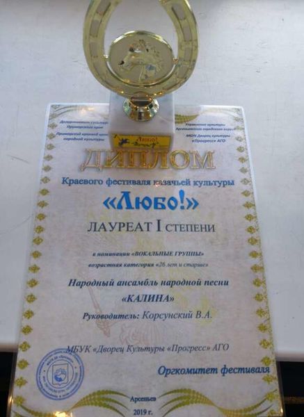 Ансамбль народной песни «Калина» завоевал Диплом лауреата I степени фестиваля «Любо!»Ансамбль народной песни "Калина" (МБУК ДК "Прогресс" г. Арсеньев), в составе которого уже много лет выступает специалист финансового отдела ПАО ААК "ПРОГРЕСС", лидирующего предприятия Приморского регионального отделения Союза машиностроителей России, Инна Носкова, в очередной раз пополнил свою творческую копилку Дипломом лауреата I степени Краевого фестиваля казачьей культуры "Любо!" Фестиваль, организованный при поддержке департамента культуры Приморского края, проходил в Арсеньеве в течение двух дней. В нём приняли участие более шестидесяти творческих коллективов и исполнителей из муниципальных образований Приморского края. 18 мая состоялся отборочный тур фестиваля. В состав жюри вошли: Владимир Владимирович Пятин – председатель президиума Дальневосточного научно-методического центра культуры и искусства Академии культуры России, профессор, Заслуженный артист Республики Казахстан; Светлана Васильевна Власова – Почётный работник высшего образования РФ, руководитель Заслуженного коллектива Приморского края Народного хора "Покров"; Евгений Владимирович Мизин – лауреат международных конкурсов вокального искусства, солист Приморской сцены Мариинского театра. А 19 мая на площади ДК "Прогресс" прошел традиционный праздник – ярмарка: работали торговые точки, была организована выставка-продажа изделий декоративно-прикладного творчества. Зрители увидели концерт участников фестиваля, дети приняли участие в казачьем обрядовом хороводе. Здесь же была оформлена выставка самых известных книг о казаках "Герои казаки и бунтари на все времена". Каждый желающий мог посетить казачий курень, где были представлены одежда и оружие казаков, старинная казачья утварь, предметы домашнего обихода, вышитые скатерти и рушники, а также исполнить песни под гармонь и отведать кашу – казачий кулеш. У гостей праздника была уникальная возможность не только посмотреть, как казаки владеют шашкой и нагайкой, но и самим поучиться овладевать этим боевым оружием. Казачьи игры и хороводы, катание на лошадях – всё это происходило на площади во время фестиваля "Любо!" Завершился праздник ярким гала-концертом и торжественной церемонией награждения победителей краевого фестиваля казачьей культуры "Любо!" «Прогресс Приморья», № 19 (532) от 24.05.2019 г. |