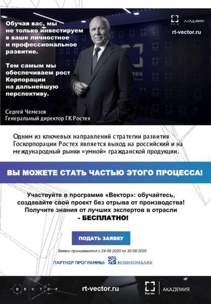Стартовал третий набор на программу «Вектор» Академии РостехаАкадемия Ростеха объявила третий набор на программу подготовки технологических лидеров "Вектор". Участие в ней могут принять сотрудники Корпорации, готовые предложить идеи по выпуску новых гражданских продуктов на предприятиях Ростеха. Программа предстанет в обновленном формате: изменятся методы обучения и принципы создания паспорта проекта. Участники проработают идею продукта и в результате получат проектную заявку, которая станет основой дальнейшего развития проекта. Руководитель программы "Вектор" Андрей Батрименко рассказывает, что к старту третьего набора программа претерпела достаточно серьезные изменения в образовательной части. "Программа обучения представляет собой уникальный алгоритм, прохождение которого позволяет сформировать у участников продуктовое видение, ориентацию на клиента при создании высокотехнологичных продуктов, – рассказал Андрей Батрименко. – Участники третьего набора будут не просто получать знания, после чего заполнять паспорт проекта. Они будут делать это параллельно в так называемом визарде, тем самым закрепляя полученные знания на практике. В ходе обучения участники смогут проработать концепцию продукта, сформировать необходимые компетенции в команде, а также с минимальными ресурсами протестировать и реализовать идею или же быстро понять, что она нежизнеспособна". Программа "Вектор" – это гибкая экосистема развития инноваций. Программа стартовала в августе 2018 года. Она направлена на повышение квалификации сотрудников предприятий ОПК в области создания и развития технологической продукции гражданского назначения. Программа объединила знания и опыт лучших экспертов отрасли, передовые российские и зарубежные практики. За два года заявки на участие в "Векторе" подали 7300 сотрудников Ростеха, 3100 из них получили доступ к онлайн-обучению, 900 подали идеи продуктов гражданского назначения. Пять проектов-победителей первого набора вошли в бизнес-акселератор Ростеха и получили финансирование на реализацию своих проектов в готовый продукт. Надо отметить, что старт третьего потока – 24 августа – практически совпадает с финалом второго. Финал программы состоится в онлайн-формате 21 и 28 августа. Двадцать восемь финалистов, в том числе сотрудник Арсеньевской авиационной компании "Прогресс" им. Н. И. Сазыкина инженер-конструктор отдела главного металлурга Евгений Клюкман, презентуют свои изобретения руководству Госкорпорации Ростех. Жюри выберет лучшие проекты, которые войдут в состав акселератора Госкорпорации. Академия Ростеха – это центр экспертизы Госкорпорации в сфере развития человеческого капитала. Главная задача Академии – помогать сотрудникам предприятий Ростеха получать знания и навыки, которые необходимы для реализации стратегии Госкорпорации. В портфеле Академии более 60 образовательных программ и консалтинговых продуктов. С момента создания в 2017 году Академия Ростеха провела более 300 образовательных мероприятий, в которых приняли участие 6000 сотрудников из 250 организаций Госкорпорации Ростех. Прием заявок на онлайн-обучение (без отрыва от производства) ведется с 24.08.2020 г. по 30.09.2020 г. на сайте rt-vector.ru Контактное лицо: главный специалист по развитию персонала Управления кадровой политики и развития пер