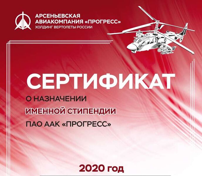 Стипендия для сотрудников «Прогресса»В Арсеньевской авиационной компании "Прогресс" им. Н. И. Сазыкина для мотивации специалистов предприятия на ведение проектной и научно-исследовательской работы, направленной на решение производственных задач и развитие авиастроительной отрасли, учреждена именная стипендия предприятия ПАО ААК "ПРОГРЕСС". В ПАО ААК "ПРОГРЕСС" трудятся более пяти тысяч работников. Знания в области металлургии, метрологии, производства летательных аппаратов, а также конструкторских и технологических разработок бесценны, и наработанный годами опыт делает их поистине высококлассными специалистами. Руководство предприятия, отмечая производственные успехи и активную жизненную позицию сотрудников, старается всячески поощрять талантливых и перспективных. И сегодня им предоставляется уникальная возможность стать претендентом на соискание именной стипендии. Для участия в конкурсном отборе на соискание именной стипендии ПАО ААК "ПРОГРЕСС" по результатам 2020 года допускаются работники авиационной компании, имеющие достижения в проектной и научно-исследовательской деятельности, направленной на решение производственных задач и развитие авиастроительной отрасли, в течение календарного года независимо от возраста. Активность и научно-технический потенциал специалистов предприятия определяется компетентной комиссией под председательством первого заместителя управляющего директора – технического директора ПАО ААК "ПРОГРЕСС" А. П. Семёнова. При отборе претендентов комиссия учитывает наличие публикаций и статей научного характера в журналах, входящих в международные базы научного цитирования (Scopus, Web of Science) и в перечень ВАК, а также индексируемых в базе РИНЦ, и в прочих печатных изданиях. Отмечается участие и победы в конкурсах, конференциях, чемпионатах и форумах всероссийского и отраслевого уровней. Также приветствуется и активная подача KAIZEN и рационализаторских предложений, которые принесли экономический эффект предприятию. Заявки и документы на соискание именной стипендии по результатам 2020 года принимаются с 01.11.2020 г. по 30.11.2020 г. в Управлении кадровой политики и развития персонала ПАО ААК "ПРОГРЕСС", каб. № 3. Компетентной комиссией по отбору конкурсных документов будут утверждены пять самых достойных и перспективных кандидатур на получение разовой именной стипендии, которая составит 35 тысяч рублей. Ознакомиться с перечнем документов и порядком проведения конкурсного отбора на получение именной стипендии можно по ссылке \\srvfile\Общая\511\СТИПЕНДИЯ. Всю информацию можно получить по тел. 74-61, И. А. Клочкова. «Прогресс Приморья», № 34 (597) от 23.10.2020 г. |