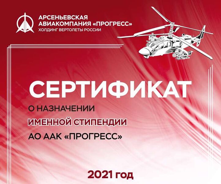 Именная стипендия АО ААК «ПРОГРЕСС» ждёт победителейВ Арсеньевской авиационной компании "Прогресс" им. Н. И. Сазыкина, являющейся лидером Приморского регионального отделения Союза машиностроителей России, объявлен конкурс на соискание именной стипендии АО ААК "ПРОГРЕСС", который стал ежегодным. Более пяти тысяч специалистов со знаниями в области металлургии, метрологии, производства летательных аппаратов, а также конструкторских и технологических разработок трудятся на предприятии, а наработанный годами опыт делает их поистине профессионалами своего дела. Руководство предприятия, отмечая производственные успехи, новые подходы в работе, нестандартное решение задач, в сентябре 2020 года учредило именную стипендию АО ААК "ПРОГРЕСС" для поощрения талантливых и перспективных работников. И сегодня предоставляется уникальная возможность стать получателем именной стипендии‑2021. Для участия в конкурсном отборе на соискание именной стипендии АО ААК "ПРОГРЕСС" по результатам 2021 года допускаются работники предприятия, имеющие достижения в проектной и научно-исследовательской работе, направленной на решение производственных задач и развитие авиастроительной отрасли, в течение календарного года. Возраст участников не ограничен. Активность и научно-технический потенциал конкурсантов определяется компетентной комиссией под председательством первого заместителя управляющего директора – технического директора АО ААК "ПРОГРЕСС" А. П. Семёнова. При отборе претендентов комиссия учитывает наличие публикаций и статей научно-технического характера в журналах и печатных изданиях. Отмечается участие и победы в конкурсах, конференциях, чемпионатах и форумах всероссийского и отраслевого уровней. Особую оценку имеют kaizen— и рационализаторские предложения, которые принесли экономический эффект предприятию. По итогу отбора конкурсных документов будут утверждены пять самых достойных и перспективных кандидатур на получение разовой именной стипендии, которая составляет 35 тысяч рублей. Напомним, что по итогам 2020 года именной стипендией АО ААК "ПРОГРЕСС" отмечены активные члены Приморского регионального отделения Союза машиностроителей России: начальник расчётного отдела Андрей Козлов – автор десятка научных публикаций, бронзовый призёр конкурса "Молодёжь и будущее авиации и космонавтики", участник научно-практической конференции ААК "Прогресс" "Молодёжь XXI век", 6-й научно-практической конференции Филиала ПАО "Компания "Сухой" "КнААЗ им. Ю. А. Гагарина" "Исследования и перспективные разработки в машиностроении", участник конкурсов "Инженер года", "Золотая идея" и других; инженер-конструктор отдела главного металлурга Евгений Клюкман – автор научной публикации, технологический лидер проекта и финалист программы Академии Ростеха "Вектор", обладатель диплома I степени научно-практической конференции ААК "Прогресс" "Молодёжь XXI век", участник конкурса "Молодёжь и будущее авиации и космонавтики", IX Международного промышленного форума "Инженеры будущего‑2020", разработчик нескольких kaizen-предложений; начальник бюро прочности и массы отдела главного конструктора Иван Кумченко – обладатель диплома II степени научно-практической конференции ААК "Прогресс" "Молодёжь XXI век", руководитель проектов учащихся инженерного класса; заместитель
