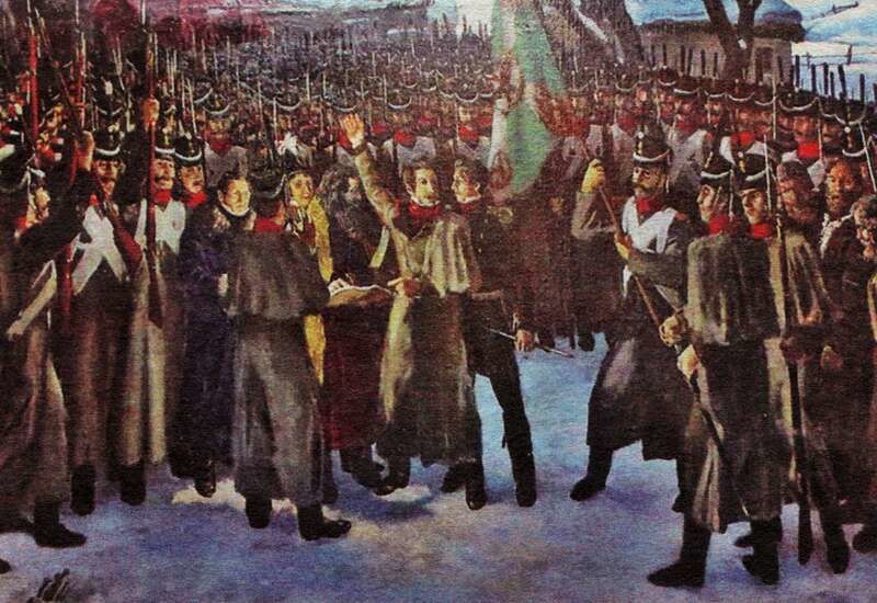 «Страшно далеки они от народа…»Окончание. Начало в № 1 Иван Сухинов возвращался из Киева в свой полк и завернул в Васильков. Остановился он у поручика Кузьмина, соратника по Южному обществу. И тут ему вручили записку от Муравьёва-Апостола, которую тот передал с солдатом. Сергей вызывал Ивана в Трилесы для обсуждения сложившейся ситуации. Офицеры незамедлительно выехали по назначению. Когда они подъезжали к месту пребывания Муравьёва-Апостола, почуяли неладное: у входа стояли жандармы. Четверо прибывших быстро обезоружили караульных. Попытались убить полковника Гебеля, однако тот своевременно укрылся в доме священника. Освободив Муравьёва-Апостола, заговорщики решили, что пришла пора действовать. Сергей сжёг все изъятые при обыске бумаги и объявил, что его полк немедленно выступает. Куда? Зачем? С какой целью? Этого, похоже, никто не понимал. В общем, заговорщики в составе Муравьёва-Апостола, поручика Щепилло, Вениамина Соловьёва оседлали коней и поскакали в село Ковалёвку, где квартировала 2-я гренадёрская рота, которой командовал штабс-капитан Соловьёв. Остальные подняли по тревоге оставшуюся в Трилесах 5-ю роту и выдвинулись следом. Муравьёв-Апостол выступил перед строем с речь, обещая долгожданную свободу. В заключение он предупредил, что лично лишит жизни того, кто ослушается его приказа. И части двинулись в Васильков, чтобы объединиться с другими подразделениями полка. Расстояние от Трилес в пределах 25 километров. Преодолели его к утру следующего дня. Вперёд был отправлен Сухинов со взводом верных, то есть "прикормленных" Муравьёвым-Апостолом солдат. В Василькове офицеры уже знали о том, что творится что-то непонятное. Старший офицер вышел навстречу Сухинову, с вопросом: что происходит? Его без объяснений отстранили, дав понять, что всё происходящее не его ума дело. Прибыли в Васильков и изъяли полковой денежный ящик. Муравьёв-Апостол построил три роты и снова принялся убеждать солдат в том, что скоро они станут свободными. Думается, он и сам не верил в то, о чём говорил. Ведь солдаты присягали императору, а не Муравьёву-Апостолу? И вдруг именно их командир, а не лично император дарует им свободу? Солдаты, уставшие после ночного многокилометрового марша, желали отдыха, и речь командира пришлась как раз кстати. Они нутром чувствовали, что по поводу объявления свободы можно хорошо поесть, и, конечно же, выпить. Офицеры колебались, в их рядах единства не было. Некоторые под шумок сбежали, другие, воздержавшиеся, отправились к местному городничему и просили, в случае разбирательств, засвидетельствовать факт того, что идут с заговорщиками не собственной воле, а под страхом смерти. Тем временем Муравьёв-Апостол приказал поднял пять рот и двинул их на Мотовиловку. 1 января 1826 года войска были на месте и встали на днёвку. Видя, что одними обещаниями сыт не будешь, Муравьёв-Апостол отдал распоряжение снабженцам: на прихваченные деньги из полковой кассы закупить спиртное. И начались тосты за свободу, равенство, братство. Вначале, вроде, всё шло по сценарию Муравьёва-Апостола, но вскоре солдаты потеряли над собой контроль, и стали офицерам вспоминать все их неверные поступки прошлого. В пылу спора срывали с офицеров эполеты. Затем пошли по домам. В общем, праздник продолжался. Вероятно, Муравьёв-Апостол понял, что пора навести в частях п