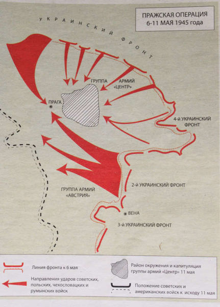 Бой после победыНесмотря на то что был подписан Акт о безоговорочной капитуляции фашистской Германии, командование Красной Армии предостерегало советские войска от безмерного ликования. Это было связано с тем, что война ещё не закончилась, подтверждением чему стала Пражская весна 1945 года. Дело в том, что Берлин пал под напором советских войск, а вот в Праге шли бои до 12 мая. Эсэсовцы упорно не желали сдаваться. Главари Третьего рейха продолжали цепляться за призрачные шансы потянуть время, переждать, договориться с западными странами, союзницами СССР, находясь в безнадёжной ситуации. Весной 45-го неизбежность поражения Германии стал очевидным фактом. 29 апреля Гитлер, решивший покончить с собой, огласил политическое завещание, в котором назначил своим преемником гросс-адмирала Карла Дёница. Новоиспечённый фюрер Третьего рейха провозгласил своей целью подписание мира на Западе и вывод максимального количества личного состава и материальных ценностей с территорий, которые могут попасть в зону советской оккупации. Фактически он продолжил линию окружения Гитлера, которое надеялось предложить Западу свои услуги в качестве антикоммунистического форпоста. По это причине агония Третьего рейха искусственно затягивалась. На 1 мая под немецким управлением, помимо собственной части Германии, из оккупированных территорий оставались только Дания, часть Норвегии, большая часть Голландии, протекторат Чехия и Моравия и часть Австрии. Последним союзником Германии оставалась лишь Хорватия. Перед Дёницем стояли три непростых вопроса: имеет ли вообще удержание этих территорий какой-то практический смысл? Стоит ли удерживать силой эти территории? Как выгоднее оформить капитуляцию войск на этих территориях? Эти вопросы 3 и 4 мая поставил Дёниц в своей ставке на севере Шлезвига собравшимся на совещание гражданским и военным руководителям областей, подконтрольных новому правительству. Решили, что нужно срочно сдаваться там, где по условиям Ялтинских соглашений после войны свою власть установят западные союзники, и держать фронт против Красной Армии в тех местах, где это возможно, любой ценой. После капитуляции Берлина 2 мая единственными районами, где возможно было оказать сопротивление, оставались Чехия и Австрия. Их прикрывала группа армий "Центр" под командованием генерал-фельдмаршала Шёрнера и группа армий "Австрия" генерал-полковника Рендулича. Они понимали, что Чехия находится на грани революции, о чём и заявили Дёницу. В то же время они вместе с губернатором протектората Франком разработали меры по недопуску вхождения Красной Армии в Прагу. Франк вступил в переговоры с чешскими промышленниками, уговаривая их любыми путями оттянуть активное выступление левых сил против оккупантов, а Прагу объявили "открытым городом", то есть вывели немецкие войска. Представители чешских консервативных кругов вступили в переговоры с американцами и французами, пытаясь тем самым убедить их в передаче территории протектората и капитуляции войск. Пока шли переговоры, восемьдесят дивизий Шёрнера должны были сдерживать наступление войск 1-го, 2-го и 4-го Украинских фронтов. Южный фланг прикрывал Рендулич с полумиллионной группировкой, северное же направление было открыто. По расчётам немецкого командования, группа армий "Центр" была обеспечена на