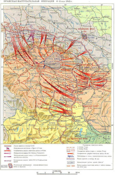 Бой после победыПродолжение. Начало 20 апреля 1 мая Дёниц настаивал на том, чтобы группа армий "Центр" отступила в Судетскую область – в Рудные горы. Там она имела бы естественный рубеж обороны и стала бы недосягаемой для Красной Армии. Но военное начальство считало, что немедленное общее отступление приведёт к разложению войск и массовому дезертирству. Впрочем, об успехах дипломатии Франка Дёниц ничего не знал – 5 мая в Праге началось восстание, которым руководили левые политические силы. Дёниц 6 мая потерял какую-либо связь и с руководством протектората, и с Шёрнером. Однако последний не собирался выполнять приказы нового лидера германского Рейха. Дёниц был убеждён, что любое сопротивление необходимо прекратить там, где это возможно, и требовал оставить все крупные города, чтобы не пострадало мирное население. Франк и Шёрнер вели собственную игру. Франк практически договорился с американцами о том, чтобы они беспрепятственно вошли в Прагу. Франк планировал, опираясь на чешских политиков правого толка, сформировать новое правительство. К началу восстания армия США под командованием Джорджа Паттона продвинулась до линии Хемниц – Карловы Вары – Пльзень, что говорило о том, что она нарушила условия соглашения с советским командованием. Сдача Чехии и Богемии англо-американскими властями, как и эвакуация полумиллионной группировки немцев со всем вооружением в их зону оккупации, естественно, не входили в планы Москвы. 6 мая незамедлительно началась операция по окружению и уничтожению армии "Центр" и освобождению Праги. Планировалось сходящимися ударами по её флангам на чешскую столицу замкнуть кольцо окружения и принудить немцев капитулировать. Перед началом Пражской наступательной операции силы армий группы "Центр" составляли до 900 000 человек, 9700 орудий и миномётов, 1900 танков и 1000 самолётов. Группа армий "Австрия" насчитывала около 600 000 солдат и офицеров, до 100 самолётов, орудий, около 4500 орудий и миномётов. Командование Красной Армии привлекло к Пражской операции 2 028 100 человек, 30 500 орудий, 2000 танков и 30 000 из состава трёх фронтов. Стоит сказать, что не все считали Шёрнера подходящей фигурой для проведения военной операции в Чехии. Вот, например, что писал участник тех событий Г. Бидерман в книге "В смертельном бою. Воспоминания командира противотанкового расчёта": "Генерал горных частей Фердинанд Дитль, профессиональный до мозга костей офицер, как-то сказал о Шёрнере, что тому было бы лучше служить фельджандармом (которых солдаты именовали "цепными псами"), чем генералом. Это мнение широко разделялось в войсках. Которые всё ещё были восприимчивы в том, что касалось их руководителей. Любопытно, что этот же самый генерал, не проявивший никакого понимания своих войск на фронте и бессердечно осудивший их на смерть своими приказами любой ценой удержать неудерживаемые позиции, в конце войны попал в плен к американцам в одной альпийской хижине, куда он бежал в попытке уйти от ответа за свои дела после сдачи Германии. Когда он попал в плен, на нём был традиционный баварский альпийский костюм, который он выменял на свою униформу, и золотой партийный значок. Лишь за несколько недель до этого он подверг массовым казням немыслимое количество своих солдат за подобные проявления трусости". Вероятно, генерал Шёрнер не предполагал, что события 