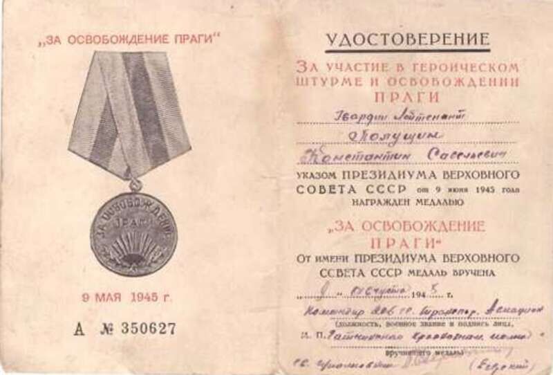 Медаль «За освобождение Праги»В музее Публичного акционерного общества "Аскольд", завода, который является одним из лидеров Приморского регионального отделения Союза машиностроителей России, хранится много интересных архивных материалов, документов, фотографий, рассказывающих об истории и трудовой славе предприятия, в том числе о ветеранах Великой Отечественной войны. Среди прочих документов есть автобиография участника Великой Отечественной войны Константина Савельевича Полущина. А еще – его фотография и удостоверение за участие в героическом штурме и освобождении Праги. Документы, о существовании которых, может, и не знают его родные и близкие, но которые дают возможность прикоснуться к воспоминаниям ветерана войны через столько долгих лет. Константин Савельевич родился в Одессе 18 июня 1923 года в семье рабочего. Так сложилась жизнь, что его родители расстались. Его мама вынуждена была устроиться на работу в артель "Стройвойлок". В 1938 году снова вышла замуж. В 1941 году отчим ушел на фронт, а семью эвакуировали в город Новосибирск. Константин не успел окончить десять классов, потому что в марте 1941-го добровольно пошел служить в армию. Был зачислен курсантом Павлоградского военного авиационного училища стрелков-бомбардиров. В августе 41-го школа была эвакуирована в город Челябинск Уральского военного округа, где он проучился до октября 1943 года. Затем, до марта 1944-го, продолжал учебу в Первой Высшей школе штурманов и летчиков дальнего действия, позже стал слушателем летного центра штурманов Московского военного округа. Фронтовые дороги Константина Полущина начались с мая 1944 года и продолжились до конца Великой Отечественной войны. Он служил штурманом корабля в составе седьмого гвардейского бомбардировочного авиационного Гатчинского Краснознаменного полка Ленинградского и 1-го Украинского фронтов. В июле 45-го их полк перебазировался в Приморский край. А в августе Константин Савельевич уже участвовал в разгроме милитаристской Японии. За свой ратный подвиг гвардии лейтенант Константин Савельевич Полущин награжден медалями "За отвагу", "За освобождение Праги", "За победу над Германией", "За победу над Японией", "За освобождение Кореи". После войны служил в 206-м транспортном Гатчинском Краснознаменном авиационном полку в качестве штурмана отряда. В 1951 году удостоен медали "За боевые заслуги". В 1955-м ему вручили орден Красной Звезды за полеты в сложных метеоусловиях. В 1956 году вторично награжден орденом Красной Звезды. Константин Савельевич Полущин был уволен в запас в 1960 году по сокращению штатов с правом ношения военной формы. В мирное время работал на машиностроительном заводе "Аскольд". Ушел из жизни в 1977 году. «Прогресс Приморья», № 3 (609) от 29.01.2021 г. |