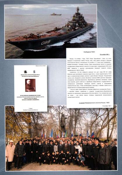 325 лет Российскому флоту!20 октября исполнилось 325 лет со Дня создания российского флота. В честь этой важной даты в Москве, на острове в Измайловском парке, у памятника Петру Великому Общероссийское Движение Поддержки Флота совместно с руководителями и представителями государственных, муниципальных, общественных организаций города Москвы, Московской области и ряда других регионов России провели, ставший традиционным, Торжественный сбор. Не осталось в стороне и Приморское региональное отделение ДПФ. Газета Приморского регионального отделения Союза машиностроителей России (№ 30) информировала читателей о подготовке к 30-летию Общероссийского Движения Поддержки Флота (ДПФ), которое приходится на сентябрь текущего года. В статье "30 лет Общероссийскому Движению Поддержки Флота" Н. М. Минаков, капитан 1 ранга запаса, председатель Приморского регионального отделения ДПФ рассказал о начале деятельности и становлении общественной организации. Продолжая разговор, корреспондент газеты задал вопрос о том, как отмечались предыдущие юбилеи ДПФ. Вот что рассказал Николай Михайлович. – Особо торжественно, с привлечением большого числа членов ДПФ и приглашением многочисленных гостей на наш праздник, прошло двадцатилетие Движения. Тогда с юбилеем ДПФ поздравили Президент России Д. А. Медведев, председатель Правительства России В. В. Путин, министры, руководство Государственной Думы России, руководители российских государственных ведомств, главнокомандующие видов Вооруженных сил России, командующие флотами, руководители морских, речных структур, моряки, рыбаки, пограничники, речники, судостроители, судоремонтники, морские ученые, руководители общественных, политических, предпринимательских организаций, известные деятели нашего Отечества, граждане России. ДПФ поздравили руководители общественных объединений из ряда стран СНГ. – Вероятно, Движение не ограничивается в своей деятельности лишь празднованием юбилеев? – В промежутках между юбилейными датами ДПФ проводит огромную организационную работу и взаимодействует с разными структурами нашей страны. Например, в ноябре 2011 года мы провели Всероссийский круглый стол "Ломоносов: российский флот, образование и наука – задачи на XXI век". В январе 2011 года Движение обратилось к Президенту России с инициативой о начале подготовки в российско-международном масштабе к двухсотлетию открытия русскими мореплавателями Антарктиды. Мы организовали и провели в Доме ученых Российской академии наук всероссийскую конференцию "Современное осмысление великого открытия Антарктиды и общенациональная работа по развитию российского присутствия на континенте". Это мероприятие прошло в марте 2012 года. В мае того же года нами был проведён круглый стол "Взаимоотношения России, русских с другими славянскими государствами и народами". Мероприятие проходило в Международном фонде славянской письменности и культуры. В городе Рязани силами ДПФ была организована и проведена всероссийская конференции, названная "Цусимское морское сражение Русско-японской войны: взгляд сквозь время и выводы для современной России". Это было в мае 2012 года. В рамках подготовки к юбилею писателя-мариниста В. С. Пикуля в июне того же года состоялся литературно-исторический вечер "Творчество Пикуля и формирование в современ