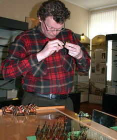 Навстречу 200-летию Бородинского сраженияГенерал… пластилиновой армии "Уланы с пестрыми значками, драгуны с конскими хвостами..." Это не только строка известного стихотворения Михаила Лермонтова "Бородино", но и краткое содержание масштабной выставки военной миниатюры, открывшейся в музее имени В. К. Арсеньева. Впрочем, есть и еще одно общее, что объединяет и стихи, и выставку — оба посвящены одному историческому событию, войне 1812 года. И самому драматическому ее эпизоду — Бородинскому сражению. А создал все это батальное великолепие один единственный человек — в недавнем прошлом профессиональный рабочий Константин Ворожбит. Мне, представителю ПРО СМР ООО СоюзМаш, случайно увидевшему поле битвы, стало безусловно интересно, тем более что хорошо знаю, каких трудов стоит изготовление той или иной детали на заводе "Прогресс", к примеру, где основная продукция — винтокрылые машины. А тут две армии множество разноцветных фигурок, в миниатюре, и, как стало известно позже, изготовлены они трудовыми руками... одного человека. Лейб-гвардейцы впереди!Наверное, нет в мире мальчишки, который не увлекался бы в детстве игрой в солдатики. У большинства это увлечение проходит с наступлением юности и появлением более "важных" и неотложных дел. Но есть и те, кто способны сохранить и свежий взгляд, и верность детскому увлечению. Константин Ворожбит из их числа. Коллекция, в которой на сегодняшний день уже более полутора тысяч (!) воинов, началась давно, в далеком ныне 1983 году. Материалы те же, что и сегодня, — пластилин, проволока, фольга. Вот только солдатики, как признается сам творец, получались некрасивыми. Может, потому и не жалеет, что из того "набора" никто не уцелел. Но позже, начав уже целенаправленную работу по созданию композиции, он уже себе такой снисходительности не позволяет. И солдатики у него экипированы тщательно, и фигурки выполнены с почти ювелирной точностью, и к вопросу сохранности подход более основательный. "Главное в моей работе — соблюдение исторической достоверности в форме, — рассказывает Константин. — Откуда беру информацию? Читаю книги, смотрю фильмы, делаю вырезки из журналов. Раньше все это собирал по крупицам. А сейчас в этом смысле очень хорошее время — выходит довольно много книг по униформе и оружию. Правда, стоят они очень дорого, но это уже неважно..." Важнее то, что получается в результате кропотливой работы — крохотные фигурки, "одетые" со всей придирчивостью эпохи наполеоновских войн. Масштаб един для всех, как для русской, так и французской армии — 1:34. И выбран он не случайно. "Фигурка получается небольшой, не давит размерами, — поясняет Константин. — Но при этом позволяет хорошо ее рассмотреть и хорошо передать все детали амуниции, обмундирования, формы. А она в те времена была очень красивая!" Из "наших" — это солдаты лейб-гвардии Семеновского и Преображенского полков, что встали на пути французских кирасир и конных гренадеров, стремившихся захватить батарею Раевского. О том, как создается вся эта красота, профессиональный рабочий рассказывает охотно. Кстати, именно рабочая сметка научила его терпению и точности в "пластилиновом" деле. Правда, в детали не вдается — много нюансов. Но суть своего увлечения передает просто — это все надо любить, тогда получится. Тем более что материал доступный, а инструменты самые