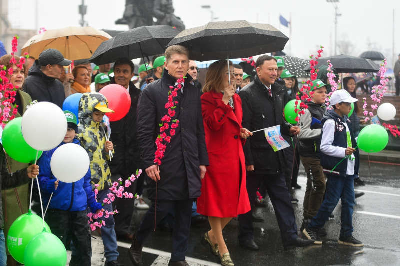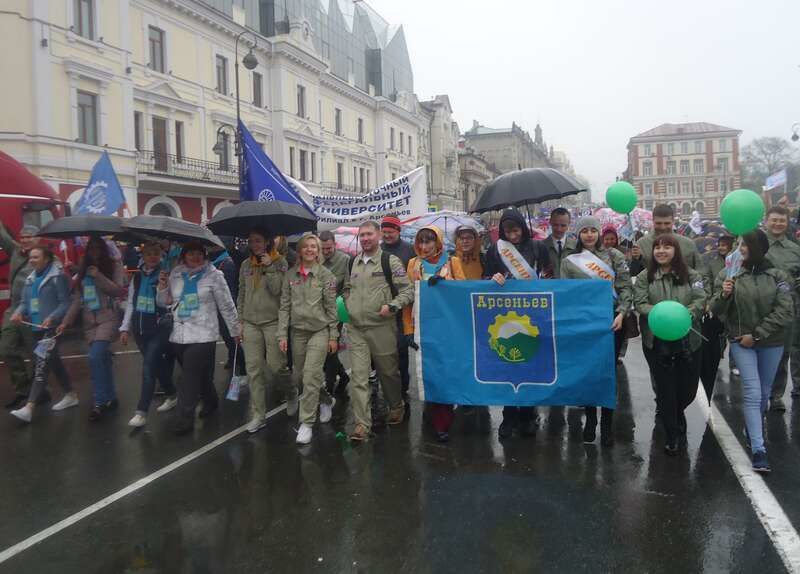 Мир! Труд! Май!Как всегда, в числе первых в стране встретили Первомай приморцы. Отметить День весны и труда вышли на главную улицу Владивостока представители всех муниципальных районов и городов Приморского края, трудовых коллективов предприятий и организаций, общественных организаций, студентов, курсантов и преподавателей учебных заведений, сотрудников учреждений социальной сферы, приверженцев политических партий, творческие коллективы, зоозащитники и волонтеры. Город в зонтахУже традиционно неласковый, Первомай встречал владивостокцев и гостей столицы Дальнего Востока дождем. Несмотря на это не менее 20 тысяч человек вышли на улицы города, чтобы представить свой рабочий коллектив или просто посмотреть на праздничное шествие. На главной площади города собралось множество иностранных туристов, снимающих демонстрацию на видео. Шествие начали колонны учебных заведений, потом прошла Федерация профсоюзов Приморского края, за ними – представители городских округов, в том числе колонна из города авиастроителей. В этом году в арсеньевской колонне торжественным маршем с флагом Союза машиностроителей России прошли представители заводов "Прогресс" и "Аскольд". Вслед за делегациями от муниципалитетов прошествовали представители политических партий и движений, школьники, спортсмены, представители культуры края, медицинские работники. Студенческие колонны представляли высшие и средние учебные заведения Приморья. Это ведущий вуз региона – ДВФУ, входящий в состав Приморского регионального отделения Союза машиностроителей России. МГУ им. Г. И. Невельского прошествовал торжественно, с оркестром, чеканя шаг. Барабанщицы открыли колонну ФГБОУ ВО "Дальрыбвтуз", следом за ними прошли студенты и преподаватели ВГУЭС. Свои учебные заведения представили студенты-медики: ТГМУ и Владивостокского базового медицинского колледжа. Прошли сотрудники коммунальной сферы, Примавтодора, железнодорожники и портовики из ВМТП. За ними на площадь Борцов за власть Советов на Дальнем Востоке вышли представители машиностроительной отрасли. Дружными рядами прошествовали представители заводов, многие из которых входят в состав Приморского регионального отделения Союза машиностроителей России. Это ДВЗ "Звезда", ССК "Звезда", ДЦСС, АО "Восточная верфь", АО "Дальзавод", ПАО "ВП “Эра”, ОА "Изумруд". Прошествовали представители рыбной промышленности, ТИНРО-Центра, пищевой индустрии: "Приморский кондитер", "Гринагро", "Владхлеб". Свои магазины представили сотрудники торговых сетей, прошли представители ресторанного бизнеса. "Почта России", компании связи и зоозащитники замыкали праздничное шествие. Губернатор Приморского края Олег Кожемяко, выступая перед публикой, подчеркнул, что люди труда – это богатство Приморского края. Он вспомнил поименно Почетных жителей Приморья, упомянул о присвоении нашему земляку С. И. Антонову – человеку, который внес большой вклад в рыбную отрасль, высокого звания Героя труда РФ. "Мы по праву гордимся нашими земляками, внесшими огромный вклад в развитие Приморского края. И будем продолжать славные традиции наших предшественников", – сказал губернатор. Как всегда, жителей и гостей города ждали локальные интерактивные зоны и праздничная концертная программа. На площади, кроме основной сцены, была организована еще одна 