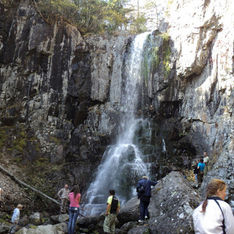 Водопад "Звезда Приморья"Путевые заметки из личного архива Водопады — это еще одна достопримечательность Приморской природы. Уссурийская тайга на хребтах Сихотэ-Алиня имеет множество ключей и рек, на которых каскадами воды ниспадают большие и малые водопады. Они самые разнообразные, многие имеют причудливые формы, но все они просто великолепны в своей красоте. Одним из наиболее доступных и интересных водопадов является водопад "Звезда Приморья", который находится на Еломовском ключе, берущем свое начало между гор Белой и Лысой хребта Пржевальского. Добраться туда мы решили в начале октября, когда осенняя листва приняла свой поразительный цвет — от темно-красных до ярко-желтых тонов. В это время года днем уже практически нет клещей, совсем нет вездесущих комаров, нет летней испепеляющей жары и по осенней прохладе можно идти на дальние расстояния без "мыла на спине". Ночи еще не такие холодные, как это бывает уже к концу октября, и поэтому достаточно комфортно можно ночевать в палатке в обычных спальных мешках, рассчитанных на температуру минус пять градусов. Наша группа, состоящая в основном из представителей Совета молодежи завода "Прогресс", входящего в приморское региональное отделение Союза машиностроителей России, заранее определив маршрут, двинулась в путь, к Еломовскому ключу. Сразу скажу, что добраться туда крайне сложно. Из центра Приморья путь к водопадам лежит через село Сергеевка Партизанского района, затем через районный центр Лазо, а затем уже к поселку Беневское. Все бы хорошо, но в тех местах некоторые участки дороги выполнены из укатанного скальника — с торчащими острыми гранями камней, которые нещадно режут шины автомобилей. Сложность в том, что последняя "шиномонтажка" находится только в Лазо, и было бы лучше возить в тех местах с собой не только штатный "банан", но как минимум еще одно запасное колесо. Как показал наш поход, такого запасного колеса в какой-то момент времени очень стало не хватать… Свернув в едва приметный поворот на дороге Лазо — Киевка, через какое-то время мы уперлись в строения отдельно стоящей усадьбы. Здесь нас уже ждали — для ночлега хозяин усадьбы предоставил нам просторный дом с печным отоплением. Мы выстроили свои машины, переоделись для похода, взяли с собой самое необходимое и тронулись в путь. Дорога к водопаду представляла собой тропу, вначале проходную для машин, а потом, после нескольких переходов через Еломовский ручей, только пешеходную. До самого водопада предстояло пройти порядка десяти километров, в общем-то, не сильно крутой подъем. Что поразило — несколько раз попадались таблички с надписями "Место для мусора". В одном месте на небольшой поляне был обустроен привал с лавкой и большим деревянным столом. Здесь мы передохнули и... обнаружили пропажу одного из детей, шедших с нами! Но к великой радости всех участников, заблудившийся Семён вскоре нашелся — восьмилетний мальчик так залюбовался красотами природы, что в какой-то момент увлеченно пошел за другой группой туристов, параллельно с нами поднимающихся к водопаду. Хотя сразу хочу сказать — заблудиться там просто невозможно! Тропа очень хорошо видна, да и люди, приезжающие сюда практически со всех уголков Приморья, нет-нет да и пройдут по тропе. По мере приближения к водопаду мне стало казаться, что температура воз