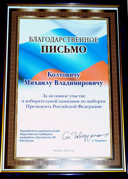 Наш нетрадиционный рассказ о человеке, который 8 июля отметит свой день рождения, будет не полным, если не сказать о том, какое место в жизни руководителя аппарата ПРО СоюзМаш России играет общественная деятельность. Его активное участие в выборной кампании президента 2012 года в составе представителя Общероссийского народного фронта была замечена в Москве и отмечена штабом ОНФ. Недавно Михаилу Колтовичу вручили Благодарственное письмо такого содержания: "…За активное участие в избирательной кампании по выборам Президента Российской Федерации. Руководитель народного штаба общественной поддержки кандидата в Президенты РФ В.В. Путина С. Говорухин. Москва, 2012 год." И это, без сомнения, высокая оценка деятельности не только самого Михаила Колтовича, но и руководимой им организации.