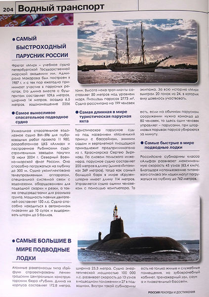 Рекорд дальности полета среднемагистрального самолетаКоллектив Казанского авиационного производственного объединения (КАПО) имени Горбунова создал среднемагистральный самолет Ту-214 с рекордной дальностью полета свыше 10 тысяч километров. Ни один самолет аналогичного класса в мире не имеет такого показателя, дальность полета базовой модели 7200 км повышена в полтора раза. Причем рекордная дистанция достигнута на том же двигателе. Но не за счет снижения веса, а благодаря улучшенной аэродинамике. В конце марта 2011 года первый Ту-214 новой модификации передан государственной авиакомпании "Россия". Самый мощный и высокотехнологичный истребительИстребитель пятого поколения Е-50 обладает свойствами малозаметности, развивает крейсерскую сверхзвуковую скорость 2,2 Маха при дальности полета 2000 км, высокую интеграцию систем управления. В пушечное вооружение входит Самый быстрый в мире боевой самолетИстребитель "Микоян МИГ-25" способен перемещаться в пространстве со скоростью 3,3 Маха (т.е. в 3,2 раза выше скорости звука), что равняется 3395 км/ч. МИГ-25 – это высотный перехватчик, набирающий высоту 35 тыс. м за 4 минуты. Самый тяжелый в мире действующий бомбардировщикБомбардировщик "Туполев Ту-160 Блекджек" имеет максимальный стартовый вес 275 т и достигает максимальной скорости 2,05 Маха (2200 км/ч). ФлотСамый крупный в мире боевой корабль на воздушной подушкеРакетный корабль на воздушной подушке проекта 1239, или "Самум", предназначен для нанесения ракетных ударов по кораблям противника. По своим характеристикам он не имеет аналогов в мире. Располагая водоизмещением свыше 1000 тонн, этот корабль способен развивать крейсерскую скорость до 100 км/ч. Корабль имеет на вооружении восемь ракет типа "Москит", предназначенных для нанесения молниеносных ударов по морским и береговым целям. Среди средств, предназначенных для отражения нападения противника, выделяются 20 зенитных управляемых ракет комплекса "Оса", универсальная артиллерийская установка, скорострельный пулемет и комплекс постановки помех. "Самум" имеет полностью алюминиевый корпус. Несмотря на относительную легкость, он отличается высокой мореходностью – до 8 баллов. Корабль может действовать автономно до 10 суток. Дальность его плавания на одной заправке топливом составляет 2500 миль. Экипаж корабля насчитывает 68 человек. Самый большой боевой корабль РоссииАвианосец "Адмирал Кузнецов" разработан в Невском проектно-конструкторском бюро. Полное водоизмещение авианосца составляет 67500 т при длине корпуса в 305 м, осадке 11 м и ширине полетной палубы 72 м. Судовая энергетическая установка в 200 тыс. л.с. позволяет развивать скорость в 29 узлов при дальности плавания в 8 тыс. миль. Экипаж в 1960 человек обслуживает авиагруппу из 52 самолетов и вертолетов, а также многочисленное бортовое вооружение. Самые большие в мире ракетные крейсерыАтомные ракетные крейсеры типа "Адмирал Ушаков" имеют длину корпуса 252 м, ширину – 28 м, осадку – 11 м. Полное водоизмещение — 24300 тонн. Имея ядерную энергетическую установку мощностью 140 тыс. л.с., крейсер при неограниченной дальности плавания развивает скорость до 31 узла. Самое выносливое спасательное подводное судноУникальное спасательное водолазное судно ВМ-569 для глубоководных работ проекта 11980, разработанное ЦКБ "Алмаз" и построенное Рыбинским судостроительным заводом пол