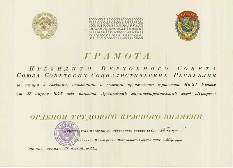 Легендарный Ми-24: 50 лет со дня первого подъёмаМногие бывшие и нынешние работники ПАО ААК "ПРОГРЕСС", сегодняшнего лидера Приморского регионального отделения Союза машиностроителей России, до сих пор с теплотой и воодушевлением вспоминают те годы, когда завод ударными темпами выпускал легендарные вертолеты Ми‑24. Это неудивительно, ведь в период с 1970 по 1990 годы на "Прогрессе" было выпущено около 2500 вертолётов Ми‑24 различных модификаций, которые до сих пор состоят на вооружении более 40 стран мира, а само предприятие в то время сделало значительный экономический и технический шаг вперед. За время своей службы вертолеты типа Ми‑24 приняли участие более чем в четырех десятках войн и вооруженных конфликтов по всему миру, заслужив репутацию надёжных воздушных бойцов и грозных противников. Один из самых значимых среди них – афганский. В сложном горном климате и тяжёлых боевых условиях винтокрылый штурмовик поддерживал своим огнём десантные Ми‑8, помогал с воздуха подразделениям сухопутных войск. И даже в наши дни, несмотря на солидный стаж, эта мощная боевая машина продолжает исправно нести службу и по-прежнему остается одной из лучших в мире. Но сегодня мы вспоминаем об этом вертолёте не за его боевые качества, а потому, что ровно 50 лет назад, 5 ноября 1970 года, состоялся первый полёт вертолёта Ми‑24А с заводского аэродрома. Подробнее об этом значимом событии можно прочесть в книге Н. Т. Рыбака "История создания и развития авиакомпании "Прогресс" и в книге А. М. Бортника "Летать во сне и наяву". Освоение6 мая 1968 года вышло постановление Совета министров СССР № 309-119 "О постановке на производство на заводе "Прогресс" вертолёта Ми‑24". В рекордно короткие сроки на завод стала поступать конструкторская документация, а с 1969 года начинается производство первых в СССР транспортно-боевых вертолётов Ми‑24А. Тогда этот вертолет в документах называли "Изделие В‑24". Работа была очень напряженной, приходилось трудиться в несколько смен. В архиве предприятия сохранился приказ директора, устанавливающий некоторые выходные дни рабочими, что помогло увеличить сроки работы. Численность цеха окончательной сборки в то время увеличилась до 300 человек, пришло много молодёжи. В процессе работы возникало множество вопросов, но на предприятии всегда находилась большая группа конструкторов из Конструкторского бюро имени М. Л. Миля во главе с заместителем главного конструктора В. С. Отделенцевым. Они тут же вносили конструктивные изменения. Решения принимались молниеносно, и порой, по словам современников, даже чертежи "набрасывали" тут же на оберточную бумагу да и вообще на все, что было под рукой. А вместо стола в спешке зачастую использовалось собственное колено. Уже в конце октября 1970 года сборочный цех отрапортовал о готовности первой машины Ми‑24А для передачи ее на испытания. Таким образом, увеличенное количество рабочих дней, смен – все это и позволило директору уже 4 ноября начать подписывать приказы о премировании отдельных работников, выполнивших особо важные задания в сроки графика, с преамбулой: "за освоение и сдачу первого изделия В‑24". Первый полётСогласно приказам директора завода Н. И. Сазыкина, находящимся в заводском архиве, плановая дата первого подъема Ми‑24 была приурочена к празднику 7 ноября. В 1970 году страна готовилась отметить 53-ю го