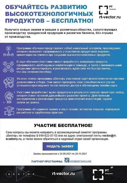 Продолжается четвёртый набор программы «Вектор» Академии РостехаАкадемия Ростеха приглашает к участию в программе подготовки технологических лидеров "Вектор 4.0" сотрудников Госкорпорации, готовых предложить идеи по выпуску новой гражданской продукции на предприятиях Ростеха. В рамках "Вектора" сотрудники пройдут комплексное обучение, а также получат возможности для финансирования и реализации своих проектных идей. Прием заявок стартовал 23 августа и продлится до 25 октября. Чтобы стать участником четвёртого набора, сотруднику Ростеха необходимо заполнить проектную заявку с описанием идеи и бизнес-плана и пройти тестирование. По результатам первого этапа будет отобрано топ‑100 технологических лидеров Госкорпорации. Они представят свой проект экспертному жюри, получат доступ к бесплатному обучению и пройдут комплексную диагностику компетенций. "Одна из главных ценностей программы – это обучение. Технологические лидеры получают доступ к курсам, среди которых – вебинары по личной эффективности, модули по проектному управлению и маркетингу, тренинги по управлению командами и креативному мышлению и многое другое, – рассказывает директор Центра развития новых продуктов Академии Ростеха Андрей Батрименко. – То есть даже если участник не пройдёт в финал, благодаря "Вектору" он сможет грамотно "упаковать" свой проект, составить бизнес-план и получить актуальные знания по продакт-менеджменту для дальнейшего развития продукта". Одним из новых инструментов обучения в этом году стали онлайн-тренажёры, которые позволят участникам в интерактивном формате проработать навыки проблемного интервью и анализа рынка. Доступ к этим инструментам получат все сотрудники, которые успешно пройдут тестирование и диагностику на первом этапе. Академия Ростеха проводит программу "Вектор" с 2018 года. За три года подано более 11 тыс. заявок, 276 предприятий Ростеха приняли участие в программе, 19 проектов прошли в бизнес-акселератор Госкорпорации и получили финансирование. На реализацию проектов – победителей трёх наборов, которые перешли в бизнес-акселератор Госкорпорации, было выделено 526 млн. рублей. «Прогресс Приморья», № 40 (646) от 22.10.2021 г. |