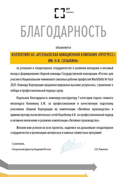 Сотрудники ААК «Прогресс» получили именную стипендиюПять молодых специалистов Арсеньевской авиакомпании "Прогресс" в декабре минувшего года были награждены именной стипендией предприятия за ведение проектной и научно-исследовательской работы, направленной на решение производственных задач в течение 2021 года. Ежегодная именная стипендия ААК "Прогресс" присуждается на конкурсной основе. Потенциал соискателей определяется результатами проектной и научно-исследовательской деятельности, публикациями в изданиях и журналах, участием в конкурсах, конференциях, чемпионатах, форумах всероссийского и отраслевого уровней, наличием kaizen— и рационализаторских предложений, которые принесли экономический эффект предприятию, и иными достижениями. К участию в конкурсе допускаются все работники ААК "Прогресс", независимо от возраста. В результате рассмотрения девяти поданных в 2021 году заявок конкурсной комиссией под председательством первого заместителя управляющего директора – технического директора Андрея Семёнова были определены 5 победителей. Инженер-конструктор 1 категории отдела главного металлурга Евгений Клюкман – организатор и главный эксперт отборочного Корпоративного чемпионата RostecSkills‑2021 по компетенции "Литейное производство", лауреат II степени шестой научно-практической конференции молодых учёных и специалистов "Исследования и перспективные разработки в машиностроении", главный эксперт и соорганизатор VIII национального чемпионата сквозных рабочих профессий высокотехнологичных отраслей промышленности по методике WorldSkills Hi-Tech, призёр XI Национальной научно-технической конференции Союза машиностроителей России, лауреат 2 и 3 степени X научно-практической конференции "Молодёжь XXI век", победитель конкурса среди авторов kaizen-предложений, обладатель благодарственных писем и ряда других наград. Инженер-технолог отдела разработки управляющих программ для серийного производства Владислав Рыбальченко – призёр VIII национального чемпионата сквозных рабочих профессий высокотехнологичных отраслей промышленности по методике WorldSkills в компетенции "Фрезерные работы на станках с ЧПУ", призёр VI Корпоративного чемпионата профессионального мастерства холдинга "Вертолёты России", победитель отборочного Корпоративного чемпионата RostecSkills‑2021, участник курсов повышения квалификации. Заместитель начальника литейного цеха по технологии и внедрению Алексей Приходько (в настоящее время – заместитель технического директора ВР "Литейное производство") – эксперт отборочного Корпоративного чемпионата RostecSkills‑2021 по компетенции "Литейное производство", победитель отборочного чемпионата профессионального мастерства по стандартам WorldSkills в компетенции "Интернет-маркетинг", призёр отборочного Корпоративного чемпионата RostecSkills‑2021 и VIII национального чемпионата сквозных рабочих профессий высокотехнологичных отраслей промышленности по методике WorldSkills в компетенции "Интернет-маркетинг", участник образовательной программы ГК Ростех "Вектор", автор рационализаторских и kaizen-предложений. Начальник расчётного отдела Андрей Козлов – лауреат конкурса "Инженер года" в номинации "Инженерная экономика", победитель XXIV конкурса Европейской Академии для молодых учёных России по разделу "Гуманитарные науки", участник шестой научно-пр