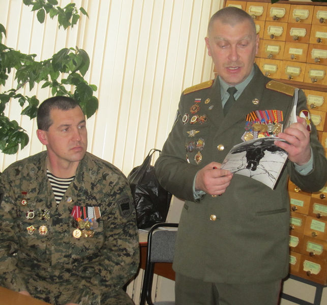 Встреча поколений — "Живая память"Ежегодно 9 декабря в нашей стране отмечается День Героев Отечества. Он был учрежден указом президента от 28 февраля 2007 года. Дата 9 декабря для такого праздника была выбрана неслучайно. Императрица Екатерина Вторая именно в этот день в 1769 году учредила новую награду, орден Святого Георгия Победоносца. Появление этого ордена стало одним из важнейших событий эпохи ее правления. Данным орденом в те времена награждались воины, которые в бою проявили особую доблесть и отвагу. До этого отмечался праздник георгиевских кавалеров. Его отмечали до 1917 года. А после Октябрьской революции этот орден и праздник были упразднены. В советское время эти награды были заменены новыми. В 2000 году, по указу президента РФ, ордену был возвращен статус высшей военной награды. Россияне, имеющие почетное звание героев, достойны собственного праздника. Ведь они так много сделали для своей страны, рискуя собственной жизнью и думая при этом не о собственном благе, а о благе своего народа. Можно с уверенностью говорить о том, что этот праздник очень важен для нас. Ведь эта дата объединяет в себе историю воинских подвигов и героев российской армии со дня ее создания и до настоящего времени. Первым героем в новейшей истории России, получившим эту награду, стал генерал-полковник Сергей Макаров. Он был удостоен этой высочайшей награды в 2008 году за мужество, проявленное во время службы в Северо-Кавказском регионе. Каждая страна гордится своими героями. Именно на примере этих людей принято воспитывать молодое поколение. Наша Родина является героической страной. Ей пришлось пережить огромное количество войн, и в каждой из них российские воины проявляли себя наилучшим образом, совершая подвиги во имя своей страны. Мы сумели выстоять благодаря их самоотверженности и мужеству. К сожалению, современная молодежь особым патриотизмом не отличается и вряд ли готова на подвиги во имя Родины. Поэтому нам так важны сегодня примеры истинного героизма, которые дает нам этот праздник. Организатор мероприятия, заведующая отделом обслуживания ЦГБ Маргарита Отрощенко представила участников военного конфликта на Северном Кавказе в разные годы: Владимир Шкода — в составе специального отряда МВД в 2001, 2004 годах был в служебной командировке в г. Грозный (Чеченская Республика), имеет несколько наград, в настоящее время работает испытателем на заводе "Прогресс", старшина запаса. Александр Кравченко — в составе специального отряда МВД несколько раз находился в служебных длительных командировках в разных горячих точках Чечни. Награжден медалями, в том числе и боевыми. В настоящее время Александр Кравченко — сотрудник полиции. Это воины прошедшие жерло войны, это защитники, в настоящее время стоящие на страже Отечества, это те, кто посвятил службе в армии всю свою жизнь. "Нашу встречу сегодня мы назвали "Живая память". Именно живая память, потому что живы те, кто воевал в Афганистане, Чечне, других горячих точках. Живая, потому что память о погибших свято хранят их товарищи по оружию, их семьи и близкие. И память эта будет жива, пока мы об этом помним, — начала встречу Маргарита Отрощенко. — Каждое время рождает своих героев. Но ратный подвиг во все времена стоял на высоком нравственном пьедестале, венчая собой лучшие качества человека — гражданина, патр