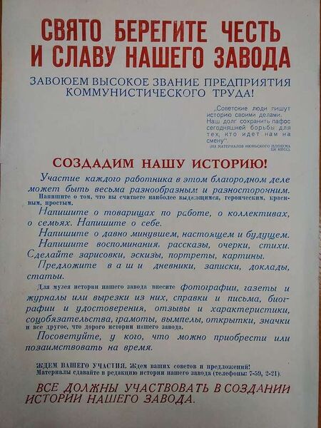 Музею истории и трудовой славы – 55!25 апреля 2021 года исполняется 55 лет Музею истории и трудовой славы Арсеньевской авиационной компании "Прогресс" им. Н. И. Сазыкина, лидирующего предприятия Приморского регионального отделения Союза машиностроителей России 1966 год – год празднования 30-летия со дня образования завода. Это был год, когда начался этап осознания необходимости сбора исторических материалов о предприятии и сохранения их для будущих поколений. Директор завода Н. И. Сазыкин приказал создать редакционную коллегию для сбора необходимых материалов и их систематизации. В комиссию вошли уважаемые работники, много лет проработавшие на предприятии, видевшие его становление, рост и развитие, всего чуть более десятка человек. Среди них – В. А. Калугин, В. М. Сахаров и И. М. Макаренко из семьи старожилов с. Семёновка (ныне г. Арсеньев). Он написал свои воспоминания о том, каким было село до появления здесь первых строителей завода, и составил карту местности с указанием семейных фамилий старожилов и основателей села, проживавших в сельских домах. В комиссию вошли первостроители завода и другие товарищи из различных заводских комитетов. Председателем комиссии был назначен В. Е. Наумчик. Всем начальникам служб завода было предписано оказывать членам редколлегии необходимую помощь и содействие. Работники завода, находившиеся на тот момент на пенсии, призвались принять активное участие в этом исторически важном мероприятии. Работа, проведенная редколлегией, оказалась очень важной. Собранные комиссией материалы: рукописи, богатые воспоминания старейших работников, фотографии, схемы и графики – легли в основу будущего музея, воплотились в выставки и экспозиции. Главное – начало музею было положено. Будучи еще на посту начальника строительства и директора завода с 1938 г. по 1959 г., Н. С. Новиков уже думал о собрании истории завода. К 1966 году он уже был не первый год на пенсии и жил в г. Жуковском Московской области. Когда же к нему обратилась редколлегия, Н. С. Новиков принял самое активное участие в организации переписки со своими бывшими на том момент коллегами – первостроителями завода – и в сборе их рукописных воспоминаний, ведь они в то время уже жили в разных уголках страны. Он сам собирал присланные ему воспоминания, а затем пересылал их в Арсеньев председателю редколлегии В. Е. Наумчику. Именно так в Арсеньеве оказались рукописные воспоминания первостроителей, которые в настоящее время хранятся в фондах музея. Благодаря В. Е. Наумчику в музее завода сохранилась и его переписка с Н. С. Новиковым. Кроме того, в апреле 2014 года В. Е. Наумчик лично передал еще одну часть переписки в фонды музея. Таким образом, коллекция писем Н. С. Новикова стала более полной. В этих письмах нашлись ответы на многие вопросы, и благодаря аккуратности и строгости Н. С. Новикова, а также его почтенному отношению к истории мы имеем меньше белых пятен в истории предприятия. А чтобы работа по сбору воспоминаний в Арсеньеве шла лучше, В. Е. Наумчик в одном из своих писем попросил Н. С. Новикова, по-прежнему пользовавшегося большим авторитетом среди заводчан, написать обращение к ветеранам завода, живущим в Арсеньеве. И Николай Сергеевич с удовольствием откликнулся на эту просьбу, попросив "принять горячее участие и поделиться своими воспоминаниями о преодолении 
