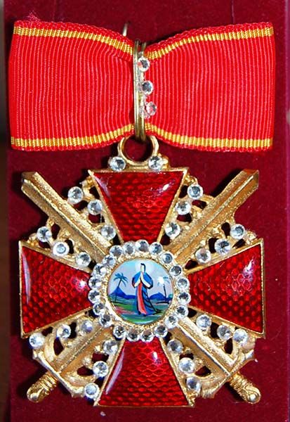 «Любящим правду, благочестие, верность»Орден Святой Анны учреждён в 1735 году Шлезвиг-Гольштинским герцогом Карлом Фридрихом. Имел одну степень. Число кавалеров ордена равнялось 15, включая герцога. 5 апреля 1797 года причислен к российским орденам императором Павлом I. До 1815 года имел три степени, с 1815 года — четыре степени. В иерархии российских императорских орденов 1-я степень ордена занимала седьмое место после ордена Святого Андрея Первозванного, Святой Екатерины, Святого Владимира 1-й степени, Святого Александра Невского, Белого Орла, Святого Владимира 2-й степени. Всего орден имел четыре степени. Лента ордена Святой Анны: красная муаровая с жёлтой каймой, носилась через левое плечо (ширина 10 см) (по статуту 1735 года лента была красная с жёлтой каймой). Знаки ордена: первая степень — красный эмалевый крест с расширяющимися концами с золотой каймой. В середине креста, на медальоне, на белом поле изображена Святая Анна. На оборотной стороне медальона на белом поле вензель синей эмали из начальных букв девиза ордена: A.J.P.F. С 1829 по 1874 годы в качестве детали, повышающей значение награды, над крестами 1-й и 2-й степени и над медальоном звезды помещалась императорская корона. Вторая степень — такой же крест и знак 1-й степени, но меньшего размера. Носился на шее, на орденской ленте 4,5 см шириной. Звезда не полагалась. Третья степень — такой же крест, как и знак 2-й степени, но меньшего размера. Носился на шее, на орденской ленте 2,2 см шириной. С 1828 года награждённый 3-й степенью за военные подвиги получал бант на ленту. Четвёртая степень — красный эмалевый крест на золотом поле, заключённый в красный эмалевый круг, над крестом золотая императорская корона. Знак носился на эфесе военного холодного оружия: шпаги, сабли, полусабли, палаша, кортика. При награждении знаком 4-й степени за военные подвиги на дужке эфеса или поперечнике кортика с 1829 года гравировалась надпись "За храбрость". К холодному оружию был положен темляк из орденской ленты. Звезда ордена — серебряная, восьмиконечная. Носилась на правой стороне груди. В центральном медальоне звезды, на золотистом поле красный крест, вокруг креста, на красном эмалевом фоне — девиз ордена: Amantibus Justitiam, Pietatem, Fidem ("Любящим правду, благочестие, верность"). С 5 августа 1855 года на знаках и звезде ордена, жалуемых за военные отличия, помещались скрещенные через середину креста и звезды ордена мечи. До 1870 года на знаках ордена Святой Анны 1-й и 2-й степеней, жалуемых за другие отличия, когда третья степень ордена давалась за военные подвиг, мечи помещались сверху креста и верхней части звезды. «Прогресс Приморья», № 06 (418) от 16.02.2017 г. |