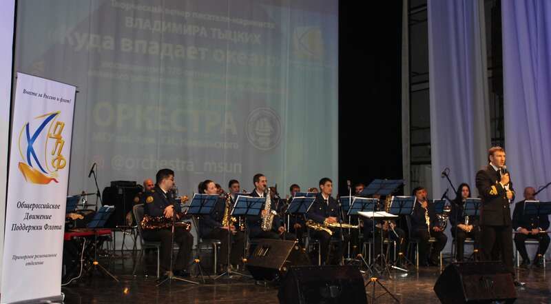 Человек – оркестр…Окончание. Начало в № 8 Как сказал Владимир Тыцких, есть какой-то небесный промысел в том, что и прошлогодняя встреча с эстрадным оркестром МГУ им. адм. Г. И. Невельского, о которой редакция газеты Приморского регионального отделения Союза машиностроителей России рассказывала на своих страницах, и встреча сегодняшняя совпали с чествованием святого праведного воина Федора Ушакова. Свет его имени греет тех, кто поднялся на эту сцену, и тех, кто пришел в этот зал. Многих в свое время море позвало к себе, а все, кто сейчас присутствует по обе стороны рампы, конечно, слышат песни, которые поет вечное море. Прежде чем звучала песня, Владимир Тыцких рассказывал краткую историю её создания. Это были увлекательные истории встреч с людьми в разных уголках Дальнего Востока. Так появились песни "Подводники", "Приморская-казачья", "Ты не ждешь", "На Русском острове дожди", "Песня о главном", "Зови меня, дорога", "Остров"… Но некоторые песни имеют просто удивительную историю. Как рассказал Владимир Тыцких, в 2004 году Международное общество пушкинистов в Нью-Йорке организовало поэтический конкурс "Пушкинская лира". Создатель уникального Пушкинского музея во Владивостоке, в прошлом офицер-тихоокеанец, подполковник морской пехоты Александр Бутырин настоятельно предложил Владимиру Тыцких принять участие в конкурсе. Ни на что не рассчитывая, с единственной целью – не огорчать главного приморского пушкиниста, Владимир Михайлович написал текст и отдал его Бутырину. Он был признан одним из лучших песенных текстов, присланных в Нью-Йорк со всего света. Автор стал победителем конкурса "Пушкинская лира". Позже к стихам музыку написал Виктор Плоткин. Так родилась "Баллада о Черной речке". Эта песня полюбилась приморцам в проникновенном исполнении Раисы Билим, которую зрители встретили бурными аплодисментами. В кулуарах Всероссийского собрания маринистов состоялось знакомство дирижера оркестра Анатолия Якименко с Сергеем Шулининым из Салехарда. Сергей рассказал тогда, что написал музыку о "Полярном Варяге" и предложил ее аранжировать и исполнить на Дальнем Востоке. Героическая история неравного боя ледокольного парохода "Александр Сибиряков" у острова Белуха в Карском море с немецким тяжелым крейсером "Адмирал Шеер", который оказал героическое сопротивление и не сдался врагу. Моряки открыли кингстон и погибли вместе с судном. В неравном бою "Александр Сибиряков" погиб, но флага перед врагом не спустил. Родилась проникновенная "Песня о Полярном Варяге", посвящённая подвигу моряков, музыку которой написал Сергей Шулинин на слова Николая Елагина. Но самой известной и популярной флотской песней стала "Полотнище Андреевского флага", написанная к 300-летию военного флота России. Много лет она входит в репертуар Ансамбля песни и пляски Тихоокеанского флота, исполнялась за рубежами России в азиатских и европейских турне флотских артистов, звучала во время праздничного представления в День Военно-морского флота во Владивостоке. Одно из немногих, а возможно, единственное произведение, полностью записанное в программе Геннадия Заволокина "Играй, гармонь любимая!". Запись "Андреевского флага" проводилась на Площади борцов революции во Владивостоке. Первыми солистами-исполнителями стали заслуженный артист России Виктор Коркишко и Анатолий 