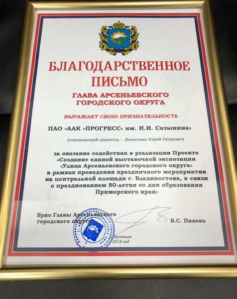 Лучшим из лучших вручены благодарностиОтмечены участники и организаторы арсеньевской экспозиции на выставке в честь 80-летия Приморского края. Врио главы Арсеньевского городского округа Владимир Пивень поблагодарил всех представителей трудовых коллективов предприятий Арсеньева, творческих объединений и общественных организаций, учреждений образования, культуры, спорта, специалистов администрации городского округа за активное участие в реализации проекта "Создание единой выставочной экспозиции "Улица Арсеньевского городского округа" в рамках празднования 80-летия со дня образования Приморского края на центральной площади г. Владивостока. Напомним, что большой праздник в честь юбилея края состоялся во Владивостоке 20 октября. Выставка под названием "Улицы Приморского края" развернулась на центральной площади краевой столицы. Церемония открытия началась с обращения врио губернатора Приморского края Олега Кожемяко – он поздравил приморцев с юбилейной датой и отметил, что на выставке представлены все муниципальные образования Приморского края. Глава региона посетил выставочные экспозиции многих муниципальных образований, в том числе и павильон Арсеньевского городского округа. Арсеньев представил достижения крупнейших предприятий: ПАО ААК "ПРОГРЕСС", ПАО "Аскольд", Арсеньевского молочного комбината и Арсеньевского квасного завода. Экспозиция нашего города вызвала огромный интерес у гостей и жителей краевой столицы. Особое внимание было приковано к роботу-манипулятору, разработанному инженерами завода "Аскольд", который угощал гостей выставки арсеньевским квасом, моделям выпускаемой в ПАО ААК "ПРОГРЕСС" продукции – вертолетам Ка‑52 "Аллигатор" и Ка‑62 и макетам кораблей музея ПАО "Аскольд". Главная туристическая достопримечательность города – сопка "Обзорная" – также стала частью экспозиции, ее дополнили модели лыжницы и хоккеиста. Юные техники городского Центра внешкольной работы учили всех желающих изготавливать модели самолетов. На творческой площадке выставки выступили арсеньевские исполнители – ансамбль народной песни "Калина" и танцевальный ансамбль "Аралия", артисты Детской школы циркового искусства "Веселая арена". Благодарность главы Арсеньевского городского округа за помощь и содействие в создании арсеньевской экспозиции объявлена представителям предприятий города, волонтерам – добровольным помощникам. Благодарственные письма вручены творческим коллективам, сотрудникам управлений администрации города, учреждений образования, культуры, спорта, работникам заводов. ПАО ААК "ПРОГРЕСС", лидер Приморского регионального отделения Союза машиностроителей России, также было отмечено Благодарственным письмом главы Арсеньевского городского округа. А именные благодарности были объявлены начальнику отдела по связям с общественностью и молодёжной политике Алексею Тюрину, заместителю главного металлурга Анатолию Лунёву и инженеру-программисту отдела по связям с общественностью и молодёжной политике Роману Яцуценко. Кроме того, арсеньевцам, достигшим высоких результатов в труде, были вручены почетные грамоты и благодарности губернатора Приморского края – в честь 80-летия со дня образования Приморья. «Прогресс Приморья», № 45 (507) от 16.11.2018 г. |