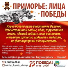 Приглашаем принять участие в проекте «Приморье: Лица Победы»В рамках Года памяти и славы члены Совета молодых депутатов и Молодежного парламента Приморского края реализуют проект "Приморье: Лица Победы", который подразумевает сохранение памяти о людях фронтового поколения, которые в годы Великой Отечественной войны внесли свой вклад в Победу. Участникам проекта необходимо изучить боевой путь участников Великой Отечественной войны, вдов, тружеников тыла, "детей войны" по их рассказам, семейным архивам, орденам и медалям, по фотографиям и документам. Для участия в проекте нужны телефон или камера, интерес к исследованию и творческий подход. Бери интервью или рассказывай сам. Видео (вертикальное, до 3 минут), комментарий к нему и данные об авторе материала присылайте на электронный адрес SMD.primorye@yandex.ru с пометкой "Приморье: Лица Победы". За лучшие работы – подарки! Подробности по телефону: 8 908 988 88 81 или в социальной сети Instagram: @molodye_deputaty_primoriya Дедлайн: 2 сентября 2020 года «Прогресс Приморья», № 13 (576) от 29.05.2020 г. |