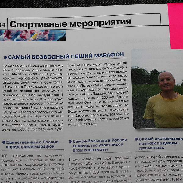 Шагающий человекОбладатель достижения, внесенного в "Книгу рекордов России", марафонец-экстремал, исследователь возможностей человеческого организма — это все один человек. Владимир Пинчук из тех, про кого иностранцы говорят "selfmademan" — человек, сделавший себя сам. В случае с Пинчуком это определение верно как никогда, поскольку всех своих невероятных рекордов преподаватель русского языка, хореограф, литератор и экспериментатор сумел достичь благодаря исключительно системе здорового образа жизни, разработанной им самостоятельно. Заметим, что он в свое время отслужил срочную в войсках связи на точке, выполнил ряд нормативов первого разряда по нескольким видам спорта, "лепил" фигуру, занимаясь атлетикой (без анаболиков), обучился бальным танцам, освоил русскую чечетку и вот уже год находится… на пенсии. Хотя назвать этого человека пенсионером язык не поворачивается. Отсюда, впрочем, и вопросы… — С чего все началось? — С того, что я стал болеть. В возрасте 42 лет меня стал периодически беспокоить желудок и начали опухать колени. Как потом выяснилось, назревал артроз коленных суставов. И это при том, что я никогда не пил и не курил, всегда занимался спортом. Конечно, после сорока — такое постепенное разрушение организма процесс естественный, и чем орган слабее, тем процессы в нем идут интенсивнее. Но почему у меня? Веду здоровый образ жизни, а болезнь все равно развивается? И я стал читать литературу, в основном по нетрадиционным методам лечения. Потому что традиционная медицина отказывалась помогать, врачи так и говорили: мы ничего не в состоянии сделать. И признавались, что они могут только порекомендовать те или иные лекарства. А принимать их или нет — дело личное. Поскольку лекарства только уменьшают боль, но не избавляют от нее вовсе. — Чье влияние из "нетрадиционников" оказалось максимальным? — Из всего прочитанного, что было издано на тот момент, в конце 90-х, по нетрадиционной медицине я взял лучшее. Ориентируясь, разумеется, на Поля Брегга и Шелтона. — А почему понадобилось создавать свою систему, а не взять уже готовую — того же Брегга? — Дело в том, что системы у него… не было! Такой, которая бы излечивала все болезни независимо от того, чем конкретно ты болен. Но тогда над созданием системы я не задумывался, мне просто хотелось вылечиться. И работал я именно в этом направлении. Именно тогда пришел к заключению, что лучший метод лечения — голодание. Но не простое, а по определенной системе. Такой у Брегга не было. Во всяком случае, до конца он ее не довел и на практике не проверил. — Получается, что удалось не просто воспользоваться наработками Брегга, но и улучшить его систему? — Да, именно так. Я создал систему, которая позволяет человеку проживать отведенный ему срок. А полный биологический срок жизни составляет 250 лет! Это, кстати, доказано даже учеными. И эту систему мне удалось довести до логического конца — она позволяет очищаться несколько больше, чем засоряться. — Если коротко в чем суть системы? И вообще, сложно ее придерживаться? — Сложно, если жить в современном обществе. Но с другой стороны, все просто, когда система — образ жизни. То есть когда ты ее принял, привык и неукоснительно придерживаешься. Даже если живешь среди людей, как все. Но образ жизни у тебя уже другой — здоровый. Сама система состоит из лечебного голо