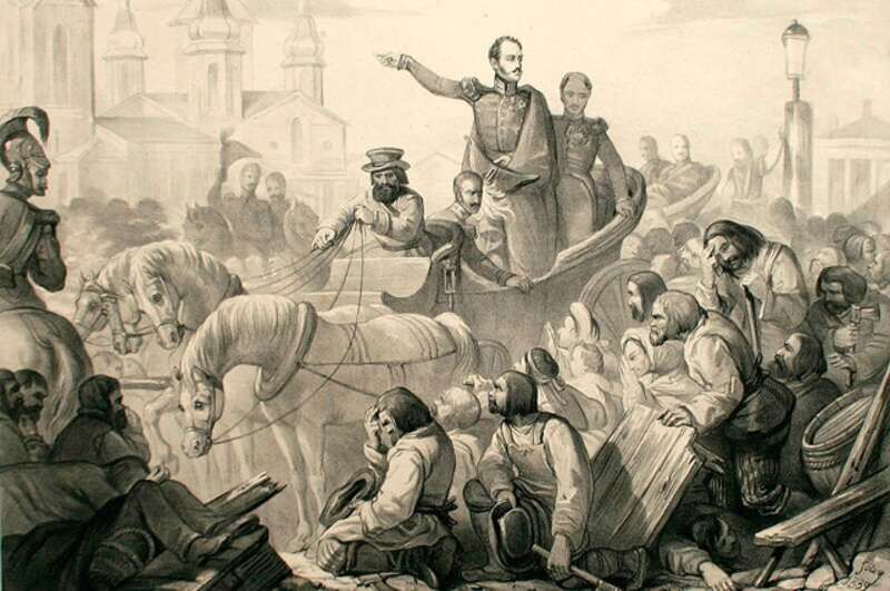 Если хочешь быть здоров – прививайсяОкончание. Начало в № 27 Николай I просто физически не смог посетить все города, объятые эпидемией, тем более что была реальная опасность заразиться. Тем временем в Тамбове пятитысячная толпа разнесла городскую больницу, а губернатора Ивана Миронова захватила в плен, освободить его удалось лишь отряду конных жандармов. Миронов приказал батальону губернаторской стражи открыть огонь, однако пожилые солдаты его приказ не выполнили. Порядок в городе восстановили регулярные части. Двоих зачинщиков бунта отправили на каторгу, восьмерых подвергли испытанию шпицрутенами. Ни те ни другие меры не принесли положительного результата. Весной 1831 года эпидемия холеры вспыхнула в пригороде Петербурга. Генерал-губернатор Пётр Эссен распорядился учредить карантин на дальних подходах к столице – в Новой Ладоге, Гдове и Нарве. 14 июня 1831 года врач Дмитрий Бланк выявил первых заболевших. Через неделю число заразившихся превысило три тысячи, из которых позже большинство скончалось. В толпе простолюдинов холера чувствовала себя как рыба в воде. Царь и двор разъехались по загородным резиденциям. Гвардейские части отправились в летние лагеря, в распоряжении Эссена остались лишь конные жандармы, лейб-гвардейцы Сапёрного батальона и батальон измайловцев. Кто-то распустил по городу слух, что врачи-немцы специально травят людей, симпатизируя полякам, которые в тот период восстали. 22 июня собравшиеся на Сенатской площади устремились к главной холерной больнице. Погромщики принялись избивать врачей, среди которых был и доктор Бланк (его брат Александр чудом спасся; он, кстати, был дедом В. И. Ленина). Больным холерой объяснили, что их пришли спасать от смерти, выталкивали на улицу, а тех, кто был прикован к постели, вместе с кроватями несли в Спасскую церковь. Эссен приказал войскам выдвигаться к месту событий, а сам выехал на открытой коляске. На Садовой его остановили – решили расправиться и с ним. Выручили измайловцы, отбив Эссена у толпы. К вечеру гвардия всё же порядок установила. Утром следующего дня на Сенатскую площадь отправился сам Николай I. Там уже собиралась толпа для возобновления погромов, но появление государя стало для людей полной неожиданностью. По официальным данным, Николай I велел всем снять головные уборы и прочитал нотацию: "Вчера были учинены здесь злодейства, общий порядок был нарушен. Стыдно русскому народу, забыв веру отцов своих, подражать буйству французов и поляков". Народ повалился на колени и каялся. Только тогда государь пообещал всем прощение. И сдержал слово: по делу о холерном бунте в столице никого к суду не привлекли. Однако этим эпидемия не закончилась. Состав жителей военных поселений Старой Руссы (Новгородская губерния) был смешанным. Тут служили солдаты и проживали крестьяне. Всё началось со слухов среди простолюдинов, которые называли виновными в эпидемии не только врачей, но и офицеров, который якобы сговорились и морили больных в карантинах. Масла в огонь подливали высланные из Петербурга рабочие, рассказывающие о том, как они "кольями выгоняли холеру". Паника тут же охватила губернию. 22 июля командир военно-рабочего батальона майор Розенмейер дал приказ подчинённым окуривать казармы. При этом они должны были переночевать на улице. Утром выяснилось, что некоторые солда