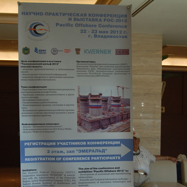 22 мая во Владивостоке в отеле "Хендэ" работала международная научно-практическая конференция и выставка "Тихоокеанский шельф-2012" (Pacific Offshore Conference, POC). Главными организаторами этого важного мероприятия являются Дальневосточный федеральный университет (ДВФУ), корпорация "Квернер" при содействии администрации Приморского края, Объединенной судостроительной корпорации (ОСК), Дальневосточного регионального отделения Российской Академии архитектуры и строительных наук (ДВРО РААСН), ОАО "Вертолеты России" и Приморского регионального отделения Союза машиностроителей России.
