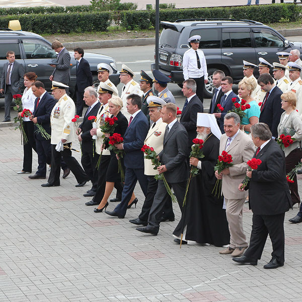 Равнение на ТОФ!"Ну ж был денек, сквозь дым летучий…". Этими строчками известного стихотворения Михаила Лермонтова теоретически можно кратко обрисовать суть знакового для Владивостока праздника — Дня Военно-морского флота. Чего-чего, а грохота, огня и порохового дыма 28 июля на празднике моряков-тихоокеанцев было в достатке… Впрочем, все началось с традиционного возложения венков к Вечному огню мемориала "Боевая слава ТОФ". Все "главные люди" города почтили своим вниманием эту торжественную церемонию. Цветы к подножию памятника несли губернатор Приморского края Владимир Миклушевский, мэр города Игорь Пушкарев, командующий Тихоокеанским флотом Сергей Авакянц, командующий войсками Восточного военного округа Константин Сиденко, председатель Законодательного Собрания Приморского края Виктор Горчаков. К ним присоединились и почетные гости праздника: заместитель председателя правительства РФ Ольга Голодец, министры труда и социальной защиты и образования и науки России — Максим Топилин и Дмитрий Ливанов. Все присутствующие почтили подвиг моряков-тихо-океанцев минутой молчания. После чего на катере командующего флотом вип-персоны отправились поздравлять с праздником флот, чьи корабли заняли отведенные им места в парадном строю в Амурском заливе. На водной станции ТОФ было многолюдно. Найти свободное место у парапета не представлялось возможным, "наблюдательный пункт" занимали ночью. Корреспонденту газеты ПРО СМР "Прогресс Приморья" посчастливилось попасть на трибуны, и благодаря этому наблюдать за праздником можно было не с "высоты птичьего полета", а в непосредственной близости от театрализованного представления, которое разворачивается раз в году, в День Военно-морского флота. В ожидании возвращения первых лиц края присутствующих развлекали самые юные из приглашенных артистов. Свое мастерство в управлении "железными конями" демонстрировали молодые спортсмены, воспитанники мотоклуба "Заря". А вот филигранную выездку на лошадях показали наездницы другого клуба — конно-спортивного, который называется "Фаворит". В кильватерном строюВ перерыве между "номерами" невидимые и всезнающие ведущие праздника перечислили корабли ТОФ, стоящие в парадном строю. Это дизельная подводная лодка, базовый тральщик, ракетный катер, малый противолодочный корабль, корабль связи, большой десантный корабль "Николай Вилков", большой противолодочный корабль "Маршал Шапошников", эскадренный миноносец "Быстрый". Флагман — гвардейский ракетный крейсер "Варяг". С трибуны было видно, что адмиральский катер останавливается ненадолго у борта каждого из кораблей для праздничного приветствия экипажей. Непосредственно торжества начались с того момента, когда "вип-десант" вернулся на берег. Поздравления губернатора Владимира Миклушевского и заместителя председателя правительства РФ Ольги Голодец были искренними и прозвучали неформально и очень тепло. Сразу после того, как гости проследовали на трибуну, под звуки государственного гимна были подняты флаги — государственный российский и Андреевский. Затем военнослужащие, представляющие роту почетного караула Владивостокского гарнизона, а также воспитанники детского патриотического клуба "Подвиг" из Магадана вынесли боевые знамена частей и соединений ТОФ, которые участвовали в Великой О
