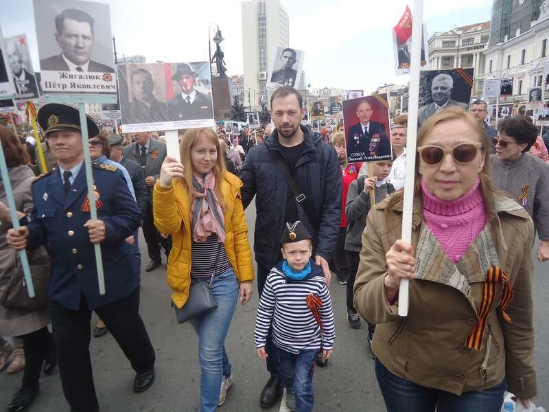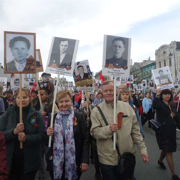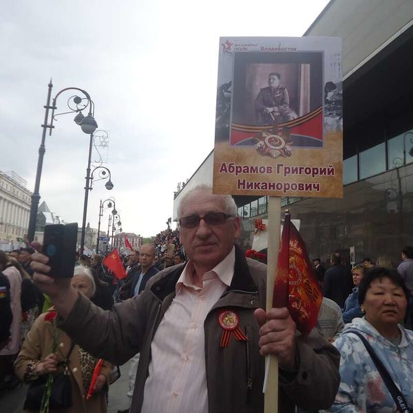 Река памяти нашей"Бессмертный полк", это триумфальное шествие памяти нашего народа, охватившее не только Россию, но, в той или иной форме, все постсоветское пространство, прошло торжественным и скорбным маршем по центральной улице Владивостока уже шестой раз. Традиция, зародившаяся в 2014 году в Томске, приняла не просто всероссийский, более того – мировой масштаб. Каждый человек, чьи предки сражались на фронтах Великой Отечественной или Второй мировой, стояли у станка в тылу или обеспечивали солдат продовольствием, чувствует свою причастность к Великой Победе нашего народа над фашизмом. Эта далекая и чудовищная война пришла в каждую советскую семью. Отцы и сыновья, матери и дочери встали на защиту своей Родины. Вся страна жила под лозунгом "Все для фронта! Все для победы!", сплотившись, наш народ сделал невозможное. На заводах и фабриках женщины, старики и дети заменили ушедших на фронт мужчин, неимоверными человеческими усилиями они добивались рекордных показателей выработки продукции, необходимой фронту. Самоотверженные советские граждане ценой непомерного героизма приближали этот день – День Победы. Практически каждый из этих длинных страшных 1 520 дней в жизни тех, кто прошел войну, был подвигом. В мясорубке войны погибли и умерли от голода, холода и болезней десятки миллионов советских людей. Сегодня почтить память героев выходят на улицы городов их потомки. Люди всех возрастов несут в руках портреты своих родных – солдат "Бессмертного полка", подаривших нам право жить в свободной стране. Любить, заводить детей, смеяться, петь, работать и отдыхать. Право быть счастливыми. К сожалению, ради этого они прошли через ад. Столица Дальнего Востока, как и все города нашей Родины, наводнилась людским потоком. Под музыку военных лет люди несли по главной улице города, Светланской, портреты своих родных и близких. Стар и млад. Вспоминая тех, кого они знали или нет, люди плакали. Многие с готовностью рассказали корреспонденту газеты Приморского регионального отделения Союза машиностроителей России о своих солдатах Победы. С портретом Григория Никаноровича Абрамова прошагал в строю "Бессмертного полка" его сын Анатолий Григорьевич Абрамов, который рассказал об отце. Уроженец Алтайского края, Григорий Никанорович прошел всю войну от первого до последнего дня. Был танкистом; награжден четырьмя орденами, медали: "За отвагу", "За оборону Ленинграда", "За освобождение Варшавы", "За освобождение Праги". Демобилизовался в 1946 году из Берлина. Вернувшись с войны, Григорий работал шофером в Алтайском крае, потом – в Казахстане. Умер в 1991 году в Казахстане. Журналист Федор Андреевич Терехов также прошел всю войну. Работал он военным корреспондентом газеты "Сталинская гвардия". Его корпус был знаменитым – Тереховский корпус. Дошел до Германии, служил и там. Имеет награды. Федор Андреевич, вернувшись с фронта, переехал жить во Владивосток, где и родился сын Владимир. На шествии "Бессмертного полка" рядом с Владимиром Федоровичем – его жена Екатерина Ивановна с портретом своего отца. Иван Константинович Скрипка, уроженец Черниговской области, Украина, пошел на войну сапером, неоднократно был ранен, но вернулся с Победой. После войны он тоже переселился на Дальний Восток, был директором совхоза в Дальнереченске. Прожил, к сожалению, недолго. Мама Екат