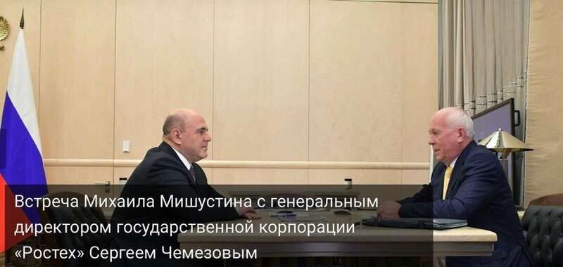 Встреча Михаила Мишустина с генеральным директором Государственной корпорации «Ростех» Сергеем ЧемезовымСостоялась рабочая встреча премьер-министра России Михаила Мишустина и генерального директора Госкорпорации "Ростех" Сергея Чемезова, на которой разговор шёл о достигнутых в прошедшем году результатах. Михаил Мишустин: Уважаемый Сергей Викторович, Вы возглавляете крупнейшую государственную корпорацию, которая на сегодняшний день производит конкурентоспособную продукцию на мировых рынках для таких отраслей, как авиация, космонавтика, медицина, а также научно-техническую продукцию высокого класса. Очень важно, что, занимаясь импортозамещением, корпорация достигла серьёзных успехов. Пример этого – полёт нашего самолёта МС‑21 с российскими двигателями ПД‑14. Это только один из примеров, их много. Хочу поблагодарить коллектив "Ростеха", который профессионально трудился и трудится над огромным количеством различных проектов. Также хотел поблагодарить вас как крупнейшего работодателя, потому что в период пандемии вы не сокращали сотрудников – это очень важно. Особо хотел бы отметить работу корпорации по производству средств индивидуальной защиты во время коронавируса. Это был очень серьёзный проект, мы нарастили в разы за считаные дни, месяцы производство всех необходимых средств индивидуальной защиты для нашего населения. Сейчас практически не закупаем ничего из-за рубежа. Как сказал Президент Российской Федерации, необходимо наращивать выпуск продукции для гражданских отраслей. Очень важно, чтобы в том числе и эти направления в "Ростехе" развивались. Хотел бы Вас послушать – и об итогах года, и о планах компании. Сергей Чемезов: Спасибо, Михаил Владимирович. Год был далеко не простым, как и для всех россиян. Тем не менее в этом году рост состоялся, хотя, может быть, не в таких больших масштабах, как хотелось бы. На сегодняшний день выручка, рассчитываем, увеличится примерно на 3 % – где-то на 1,8 трлн. Точную цифру пока ещё сказать не могу. В течение ближайших месяцев мы окончательно завершим подсчёты. Консолидированная выручка на следующий 2021 год, надеемся, превысит 2 трлн. По гособоронзаказу. На сегодняшний день образцы вооружений, которые входят в президентский список, мы полностью выполнили. Что касается военно-технического сотрудничества, то план, который был утверждён Президентом, мы выполняем. И объём будет где-то в районе 13 млрд рублей – примерно так же, как и в прошлом году. Мы продолжаем увеличивать объёмы гражданской продукции. Как Вы уже сказали, перед нами Президентом поставлена задача к 2030 году увеличить долю гражданской продукции до 50 %. Но мы для себя поставили более амбициозную задачу. И надеюсь, что мы её выполним. Мы достигнем этой цифры к 2025 году. Сегодня уже объём гражданской продукции составляет около 33 %, даже чуть больше. К гражданским отраслям корпорации относятся такие отрасли, как самолётостроение, вертолётостроение, медицина, автопром, станкостроение, дорожная, сельскохозяйственная техника, электроника и другие. Михаил Мишустин: Спасибо, Сергей Викторович. Хочу поздравить коллектив "Ростеха" и Вас лично с Новым годом и Рождеством Христовым, пожелать, чтобы все задачи, которые намечены, и особенно те задачи, которые перед нами поставил Президент по достижению национальных целей, мы выполнили