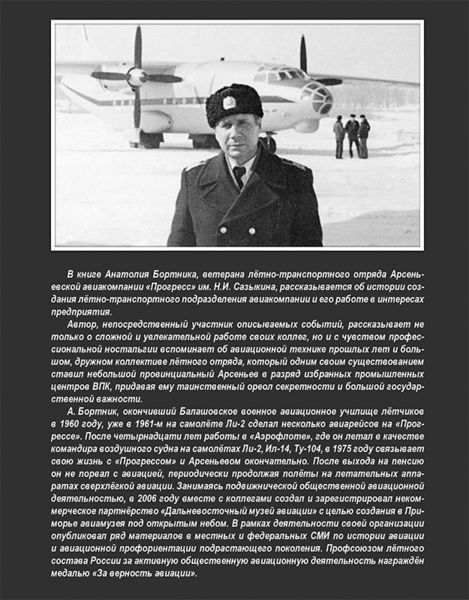 К юбилею с книгой!В праздничный день для всех авиаторов в актовом зале музея ОАО ААК "Прогресс" состоялась презентация первой книги о летно-транспортном отряде. Отличный подарок преподнёс ко Дню авиации автор книги Анатолий Маркович Бортник — ветеран завода, в прошлом командир корабля летно-транспортного отряда завода "Прогресс". Но, как известно, бывших пилотов не бывает. Вот и Анатолий Маркович энтузиаст по натуре и неравнодушный к истории своего города и завода человек, любящий небо и посвятивший ему всю свою трудовую деятельность, решил увековечить историю уже не существующего отряда. Донести до читателей и потомков собранные по крупицам факты и воспоминания "о тех, кто жил и работал в то удивительное время, о небе и самолетах, о коллегах-летчиках и их трудовых буднях". В апреле этого года исполнилось 55 лет со дня образования совершенно особого подразделения авиакомпании летно-транспортного отряда. За годы его существования сотни тонн грузов были перевезены воздушным путём сотрудниками отряда, тысячи пассажиров были доставлены в различные уголки нашей страны. 12 единиц техники находились в распоряжении летного отряда. Многие коллеги-летчики могли позавидовать такому парку машин. Но люди — это главная ценность предприятия. Летные экипажи, обслуживающий персонал, специалисты инженерно-авиационной службы и многие другие сотрудники отдела были одной большой семьёй. За 42 года воздушных перевозок 35 лет безаварийной летной работы — это заслуга всего огромного коллектива ЛТО, который насчитывал более двухсот человек. Каждый был на своем месте, каждый был необходим как маленький винтик большого механизма, трудились сплоченно и дружно. Тем горячее прошла презентация и встреча "однополчан". Сегодня на их лицах улыбки, о них помнят и их почитают. Многие знали об издании этой книги, так как были непосредственными участниками и действующими лицами событий, описанных в мемуарах. Общаясь с бывшими работниками ЛТО, с членами их семей, автор собрал богатый и ценный материал — фотографии, документы и воспоминания. Некоторые коллеги не виделись очень давно, и это приятное событие состоялось благодаря Анатолию Марковичу Бортнику, управляющему директору ОАО ААК "Прогресс", председателю ПРО СМР Юрию Петровичу Денисенко, а также организатору этого мероприятия заведующей музеем истории и трудовой славы ОАО ААК "Прогресс" им. Н.И.Сазыкина" Татьяне Болотниковой. Вот уже 13 лет нет отряда, но ветераны помнят о нём. И благодаря инициативе летчиков-ветеранов ЛТО был создан авиамузей под открытым небом, руководителем которого является Анатолий Маркович. В свою очередь управляющий директор авиакомпании "Прогресс", председатель ПРО СМР Юрий Петрович Денисенко с удовольствием поддержал эту идею. В результате создано некоммерческое партнёрство под названием "Дальневосточный музей авиации". Сейчас три машины Ан-8, Ту-134 и Ил-14, которые удалось спасти от утилизации, находятся на хранении на территории авиакомпании "Прогресс" и ждут реализации идей. Во время "Большого проезда" временно исполняющего обязанности губернатора Приморского края Владимира Миклушевского, неравнодушного к авиации, Анатолий Маркович обратился с просьбой о поддержке и включении этого проекта в программу по туризму. Мы рады вам сообщить, что этот проект нашёл отклик и поним