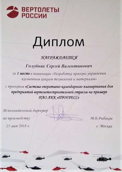 Сотрудник «Прогресса» занял первое место в конкурсе «Вертолёты XXI века»Сотрудник отдела по развитию производственной системы Арсеньевской авиационной компании "Прогресс" им. Н. И. Сазыкина, лидера Приморского регионального отделения Союза машиностроителей России, Сергей Голубник занял первое место в конкурсе проектных и конструкторских разработок "Вертолеты XXI века – 2018" холдинга "Вертолёты России". Данный конкурс рассчитан на студентов технических вузов, молодых работников производственных предприятий и конструкторских бюро холдинга. В этом году конкурсанты соревновались в пяти номинациях: "Конструкторская разработка", "Разработка новых материалов для авиационных конструкций", "Разработка новых технологий для авиационных конструкций", "Разработка проекта управления жизненным циклом технологий и материалов", "Расчетная работа". Все работы участников прошли строгий конкурсный отбор, а затем проекты, заинтересовавшие экспертную комиссию, были представлены её вниманию в рамках видеоконференции. В состав экспертной комиссии под председательством исполнительного директора холдинга "Вертолеты России" по производству Михаила Рыбакова вошли: генеральный директор компании "ВР-Технологии" Александр Охонько, начальник ОКБ МВЗ им. Миля Алексей Вайнпрес, начальник ОКБ Камова Сергей Желтов, главный конструктор Казанского вертолетного завода Антон Бушуев, начальник отдела модернизации инженерно-технического департамента Вертолетной сервисной компании Владимир Донченко и заместитель заведующего кафедрой "Проектирование вертолетов" Московского авиационного института Борис Артамонов. По решению Комиссии проект "Система оперативно-календарного планирования для предприятий вертолётостроительной отрасли на примере ПАО ААК ”ПРОГРЕСС”", представленный Сергеем Голубником, был удостоен первого места в номинации "Разработка проекта управления жизненным циклом технологий и материалов". Торжественная церемония награждения победителей конкурса состоялась 25 мая в выставочном центре "Крокус Экспо" в рамках Международной выставки вертолетной индустрии HeliRussia-2018. Победителям были вручены заслуженные дипломы, подписанные исполнительным директором холдинга "Вертолёты России" по производству Михаилом Рыбаковым. Он лично поздравил ребят с их достижениями, а также пожелал им не останавливаться на текущем уровне, и в следующем году вернуться на конкурс уже с более амбициозными проектами. Отметим, что, помимо дипломов, победители конкурса, а также участники, занявшие вторые места в каждой из номинаций, получили денежные премии. Но победа в конкурсе – это не только дипломы и призы, это, в первую очередь, долгий и упорный труд, поэтому мы подробнее остановимся на самой работе "Система оперативно-календарного планирования для предприятий вертолётостроительной отрасли на примере ПАО ААК "ПРОГРЕСС"", представленной Сергеем Голубником на конкурсе, и её практической значимости для предприятия. Данный программный продукт был создан на базе первой программы аналогичного назначения, которую внедрял директор по производству Олег Анатольевич Герман, будучи ещё начальником механического цеха, то есть более восьми лет назад. Когда же Сергей Голубник только пришел в производственно-диспетчерский отдел, эта первая версия программы была