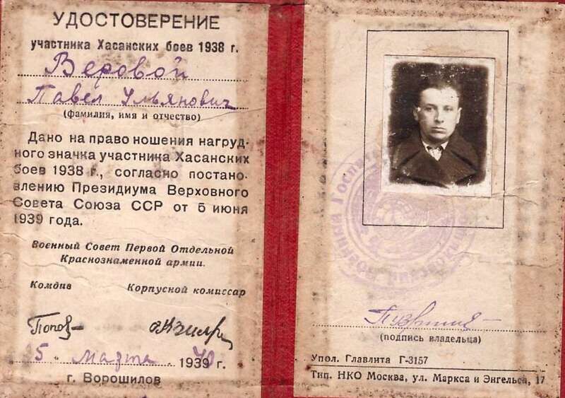 Врагу – ни пяди родной землиХасанские события 1938 года – боевые столкновения между японской империалистической армией и Рабоче-Крестьянской Красной Армией из-за оспаривания Японией принадлежности территории у озера Хасан и реки Туманной, которые длились с 29 июля по 11 августа 1938 года. Японцы сконцентрировали на нашей границе 20 тысяч солдат, 200 орудий, 70 самолетов. Со стороны моря к операции подключили 15 кораблей и столько же катеров. В июле 1938 года Красная Армия сосредоточила здесь 15 тысяч солдат, 240 орудий, 300 танков, 250 самолетов и около 1000 пулеметов. Павел Ульянович Веровой был участником боевых действий на озере Хасан. В то время он только что окончил курсы санитарных инструкторов в городе Уссурийске. На границе уже назревала гроза. Нахально вели себя самураи. Нарушали границу, устраивали провокации всякого рода, прощупывая крепость советских войск и терпение. Поэтому на душе у Павла было как-то неспокойно. Чувствовал, что придется расстаться с семьей. А вот на сколько, никто не мог предугадать. Из воспоминаний Павла Ульяновича: "В районе Хасана нагло, в открытую полезли японцы через нашу границу и спровоцировали вооруженный конфликт довольно большого масштаба, который они заранее тщательно подготовили и спланировали. У них даже было три бронепоезда. Знаю, что для одного из них вырубили горный тоннель, в котором он укрывался от нашей артиллерии и бомбардировщиков. Долго не могли наши самолеты уничтожить бронепоезд. И всё же нашим бомбардировщикам удалось завалить его прямо в тоннеле. Так сказать, начисто замуровали". Военно-полевой госпиталь, в котором служил Павел Ульянович, находился в составе 41-й стрелковой дивизии. Они прибыли на Хасан, когда там уже шли боевые действия. Для этого был совершен тяжелый походный марш под изнуряющим, казалось, бесконечным дождём. Местами солдаты шли по колено в воде, тянули за собой всю боевую технику. Хорошо слышны были бомбовые разрывы, артиллерийские обстрелы. На поле сражения уже были убитые и раненые. Быстро развернули госпиталь – три большие брезентовые палатки, в каждой из которых можно было поместить человек сто. В одной была операционная, в двух других – раненые красноармейцы. С особо тяжелыми ранениями отправляли во Владивосток. Санитары выносили раненых с поля боя, а Павел вместе с другими солдатами доставлял их в госпиталь. Раненых было очень много. Поэтому и Павлу приходилось выносить раненых из-под огня. Как и тысячи наших солдат, он мужественно и честно прошёл испытание боем. Выстояли и прогнали самураев со своей родной земли. Павел Ульянович родом с Украины. В 1932 году его земляки, деревенские парни, приехали на Дальний Восток по вербовке. И Павел потянулся за ними. Выучился на каменщика, участвовал в строительстве Уссурийского сахарного завода. – Шлакоблоки тяжелые, – вспоминал Павел Ульянович. – За день руки так уставали, что поднять не мог к вечеру. Там же, в Уссурийске, женился на красивой девушке Евгении. Воспитали и выучили пятерых детей. Позже оба супруга связали свою трудовую жизнь с городом Арсеньевом и заводом "Аскольд". Трудовой стаж Павла Ульяновича – более пятидесяти лет. Работал в цехе холодной штамповки на пружинном участке. Он обеспечивал потребности предприятия в пружинах самого различного размера и назначения. Даже были такие крошечные пружины, что в пальц