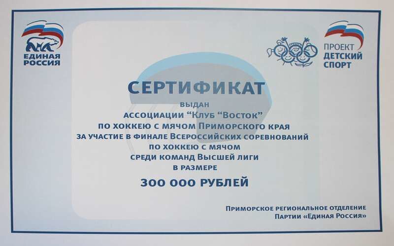 Хоккейную команду «Восток» поддержала «Единая Россия»В Общественной приемной партии "Единая Россия" исполняющий полномочия секретаря местного отделения партии "Единая Россия", управляющий директор Арсеньевской авиационной компании "Прогресс" им. Н. И. Сазыкина, председатель Приморского регионального отделения Союза машиностроителей России Юрий Петрович Денисенко вручил сертификат на 300 тыс. рублей генеральному директору ассоциации "Клуб "Восток" по хоккею с мячом" Валерию Арнольдовичу Лежнину. "Я рад вам вручить сертификат на поддержку хоккейного клуба от имени секретаря Приморского регионального отделения партии "Единая Россия" Олега Николаевича Кожемяко. Хоккей с мячом – это традиционный вид спорта в нашем городе, его любят многие жители Арсеньева. Хоккейная команда "Восток" – это наша гордость и детище завода "Прогресс", который всегда помогал команде. На протяжении многих лет сотни болельщиков собираются во время игры на трибунах стадиона, где выросло не одно поколение арсеньевцев, и это значимый момент для города, ведь спорт – это основа здоровья граждан", – отметил Юрий Денисенко. В ходе недавнего визита в Арсеньев губернатора Приморского края к Олегу Кожемяко обратился с просьбой о поддержке знаменитой команды "Восток" по хоккею с мячом ее генеральный директор Валерий Лежнин. Олег Николаевич с пониманием отнесся к проблемам хоккейного клуба, и из фондов партии "Единая Россия" выделили средства на его развитие. "Для нас это большая честь, и хочется сказать большое спасибо губернатору Олегу Кожемяко, который сразу же откликнулся на нашу просьбу, – поблагодарил Валерий Лежнин. – У нас бюджет не очень большой, а эти средства будут направлены на подготовку команды для участия в финале всероссийских соревнований по хоккею с мячом. Мы всегда находим поддержку и понимание в Правительстве Приморского края и надеемся, что и впредь такое взаимопонимание будет продолжаться. В нынешнем сезоне ребята успешно выступили, и команда получила право на участие в финальных всероссийских соревнованиях среди команд Высшей лиги. Впрочем, перед каждым сезоном мы ставим себе задачу – занять достойное место в группе и попасть в финальную часть игры. На протяжении последних семи лет мы эту задачу выполняем, и, исходя из опыта, это вполне реальная цель для нас, с которой мы успешно справились. Пусть даже уровень мастерства у ребят не такой высокий, как у игроков сибирской части нашей страны, но их полная самоотдача и самоотверженность, а главное, желание победить помогли им выйти в финал". Надо отметить, что благодаря поддержке любителей хоккея с мячом, которые массово посещали все игры хоккейного клуба "Восток", в этом сезоне все домашние встречи игроки команды "Восток" провели на достойном уровне, уступив лишь в одной игре команде "Саяны" из города Абакана. Команда по хоккею с мячом "Восток" в городе Арсеньеве была создана в 1953 году при заводе "Прогресс" (впоследствии – Арсеньевская авиационная компания "Прогресс" им. Н. И. Сазыкина). С 1958 года носит название "Восток", представляя одноимённый КФК. Сначала команда выступала в городских соревнованиях и Кубке крайсовпрофа. В 1958 году начала играть в чемпионате Приморского края, с 1959 года выступала в первенстве крайсовета ДСО "Труд", где в 1962 году стала победителем. Во всероссийских соревнования