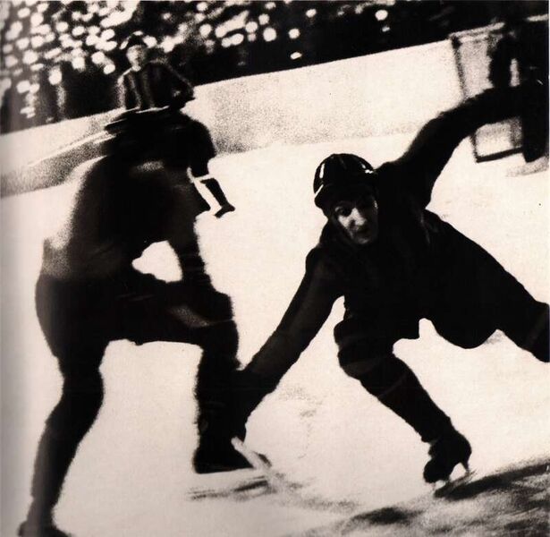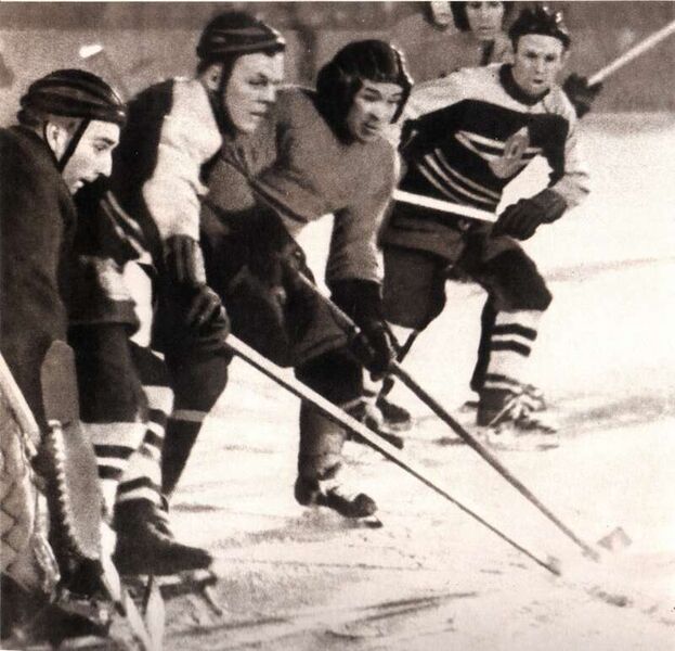 «Великолепная пятёрка и вратарь…»Продолжение. Начало в № 9 Можно смело сказать, что хоккей в нашей стране побежал сразу, и побежал лихо! И если закордонный хоккей перенял из русского немало технических приёмов, то и своих прибавил достаточно. И привнесли новшества сильнейшие на тот период универсальные хоккеисты (мяч-шайба) – В. Бобров, В. Никаноров, В. Блинков, В. Трофимов и другие. В первом сезоне некоторое время они вынуждены были успевать везде, словно Фигаро, который, то здесь, то там: днём играли в хоккей с мячом, вечером – в хоккей с шайбой. Новый хоккей стал как бы дополнением к русскому хоккею. И пришёлся нашим игрокам по душе. Всеволод Бобров сразу освоился на площадке с высокими бортами. Впрочем, он отлично играл и в футбол, и в хоккей с мячом, и добился больших результатов в канадском хоккее. Это о нём: если уж талантлив, то талантлив во всём. Закордонный хоккей просто зажёг наших игроков скоростными рывками, силовой игрой, настоящей мужской борьбой. Вскоре выяснилось, что наши не только умеют хорошо бегать на коньках, но и в силовых поединках не уступают лучшим канадским профессионалам. Если человек участвовал в хоккейных баталиях, он настоящий мужчина. Так что любовь к шайбе стала любовью с первого взгляда. Мужская игра на льду22 февраля 1946 года на стадионе "Динамо" в Москве студенты института физкультуры после окончания мачта по хоккею с мячом продемонстрировали зрителям новинку – "шинни", или, как его тогда называли, "канадский хоккей". И уже 22 декабря того же года "новинка" приобрела право гражданства – в тот день стартовало первенство СССР по канадскому хоккею. Заявились на соревнования команды Ленинграда, Москвы, РСФСР, Украинской, Белорусской, Эстонской, Литовской и Латвийской ССР. Впрочем, роль наставников поначалу отводилась латышам. Мало кто знает, что сборная Латвии к тому времени участвовала пять раз в чемпионатах мира по хоккею с шайбой. Успехи команды оставляли желать лучшего (выше десятого места латыши не поднимались), но они получили главное – опыт участия в крупных международных турнирах. Однако первое первенство СССР всё расставило по своим местам. Выяснилось, что тактическая и техническая подготовка хоккеистов из Риги хромает. Они словно продолжали играть в хоккей с мячом, используя все его технические приёмы. Они как бы остановились в своём развитии, и это отразилось на результатах: латвийская команда не попала в призёры первенства СССР. Играя в пас на высоких скоростях, московские команды "Динамо", ЦДКА и "Спартак" показали хорошую игру и со значительным отрывом обошли своих "учителей". Эта троица выявляла сильнейшего при помощи разницы забитых и пропущенных шайб. Лучшими в этом компоненте стали московские динамовцы. Первые матчи первенства страны запомнились многим советским хоккеистам, они в своих биографиях непременно вспоминали игры на "Динамо" 1946 года. Вот как тот период вспоминал хоккеист Альфред Кучевский: "Тогда я играл в хоккей с мячом за юношескую команду "Крылья Советов". Увидел как-то на "Динамо" новый, канадский, хоккей и загорелся: вот бы попробовать! Но это сейчас просто: пошёл, купил клюшку и – пробуй себе на здоровье. А в 1946 году клюшки на вес золота были… Да какое там на вес золота – бесценные – и всё тут! И когда нам, нескольким юношам, дали по клюшке из резерва команды мастеров, я на неё н